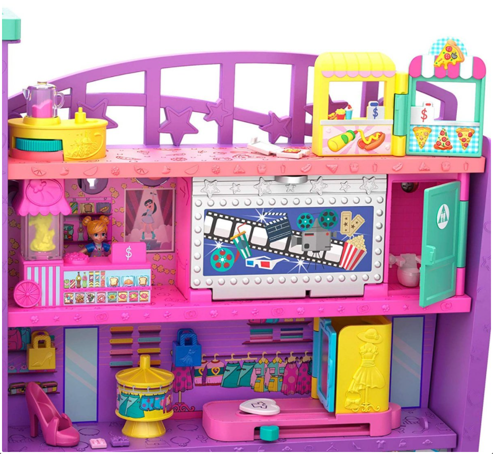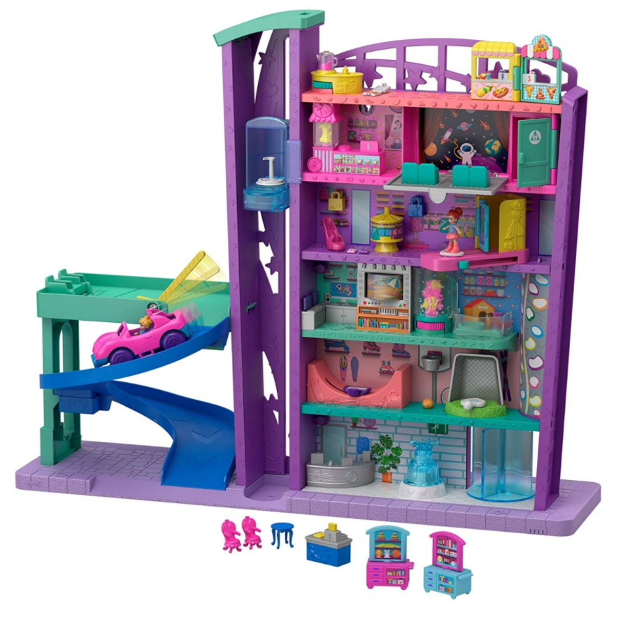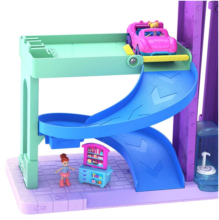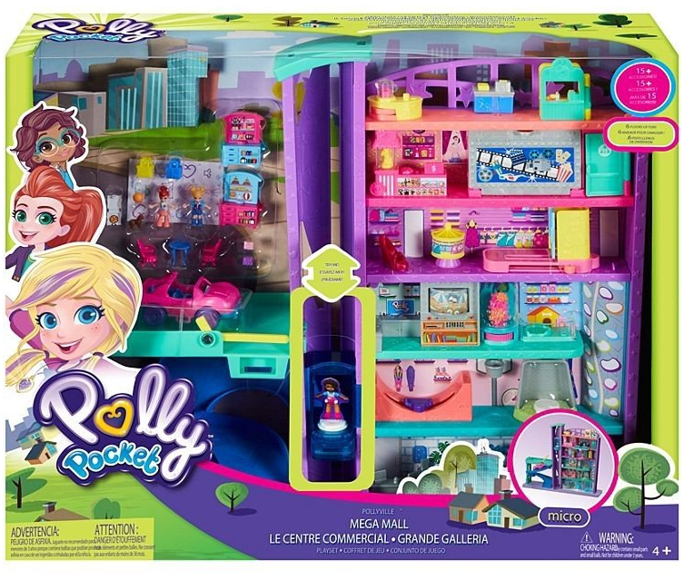 Odwiedź Pollyville, malutkie przyjazne miasteczko Polly Pocket. Znajdziesz tu mnóstwo niezwykłych miejsc do zabawy! Najlepszy sposób na spędzenie dnia w Pollyville to wizyta w centrum handlowym inspirowanym maleńkim miastem Polly. W zestawie centrum handlowe z 6 poziomami i akcesoriami do zabawy, a także parking, samochód, minilalki Polly i Lila, figurka pieska, arkusz naklejek i akcesoria.