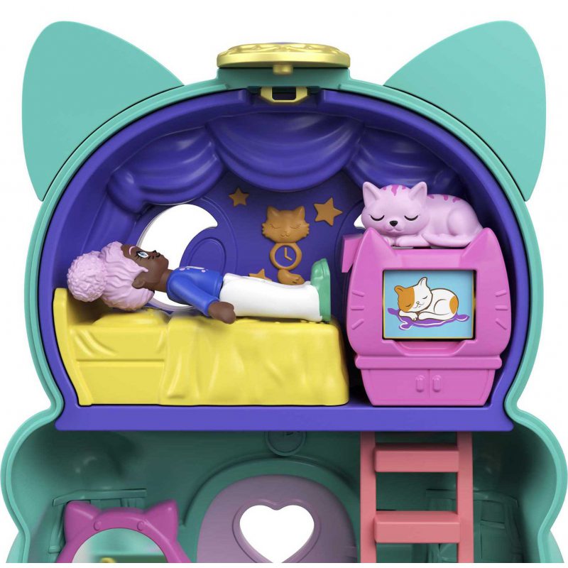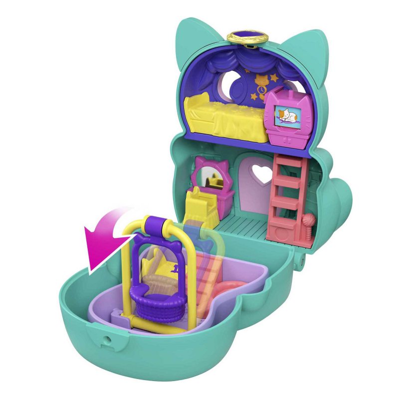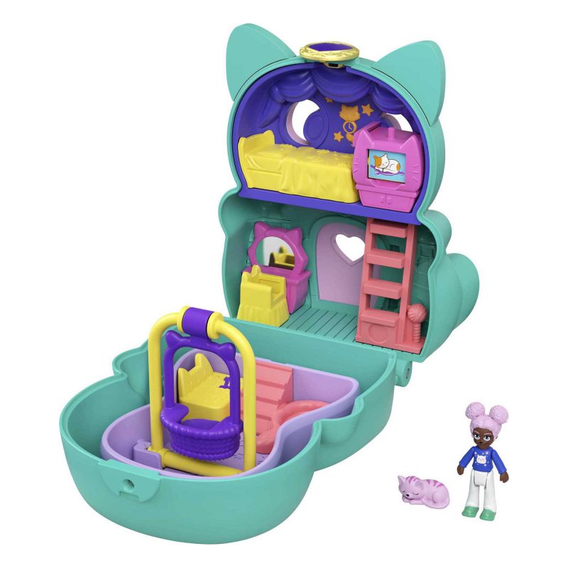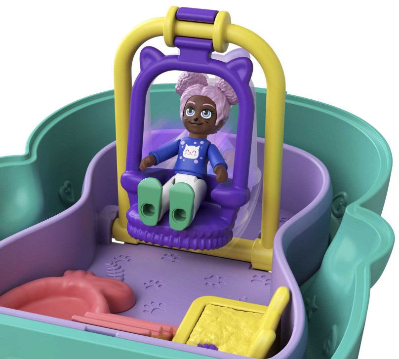 Wspaniały minizestaw Polly Pocket w kształcie kotka. Zestaw otwiera się w tradycyjny sposób (oraz o 270 stopni), tworząc tematyczny mikroświat z drzwiczkami z przodu, które też można otworzyć. Jeśli chcesz mieć dodatkowe miejsce do zabawy, przekręć kompaktową podstawę, a zabawa będzie jeszcze bardziej różnorodna! Zestaw zawiera jedną mikrolalkę z 5 ruchomymi punktami, dzięki czemu podczas zabawy można ją ustawiać w różnych pozach, a także 3 niespodzianki! Kompaktowe zestawy są idealne do zabrania ze sobą – baw się z Polly Pocket gdziekolwiek i kiedykolwiek chcesz!