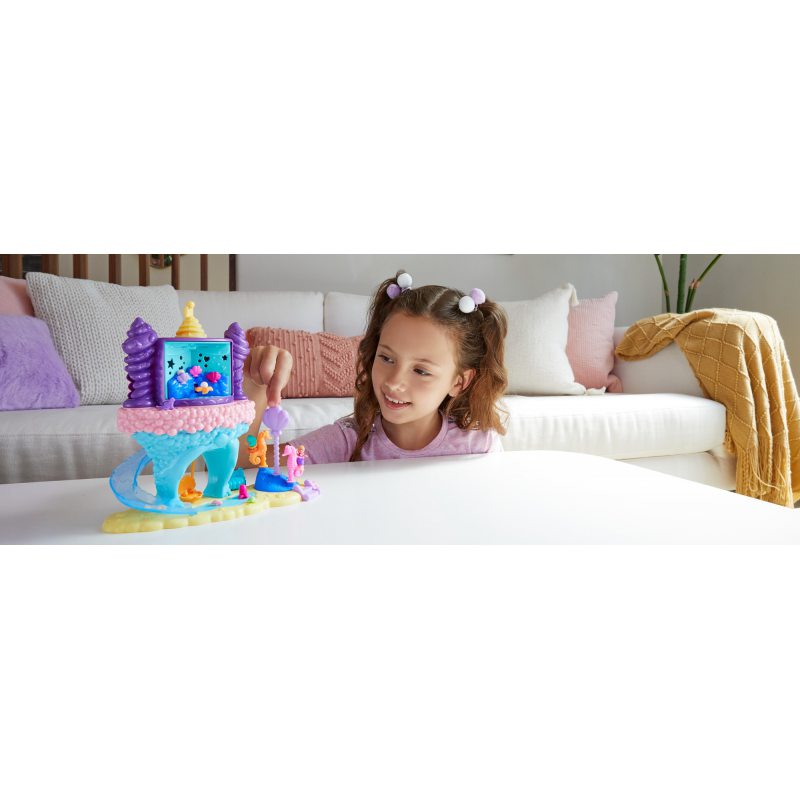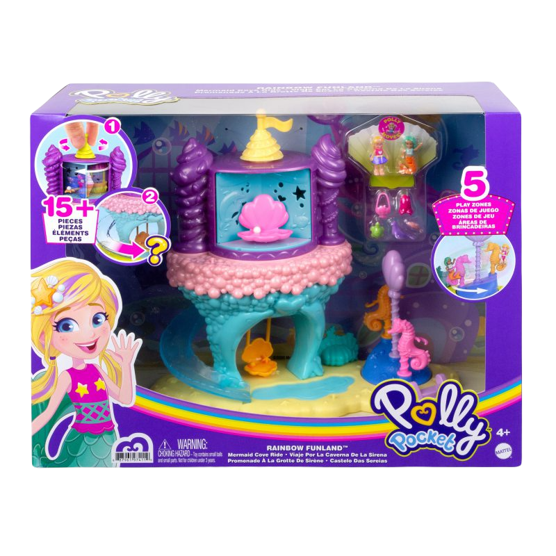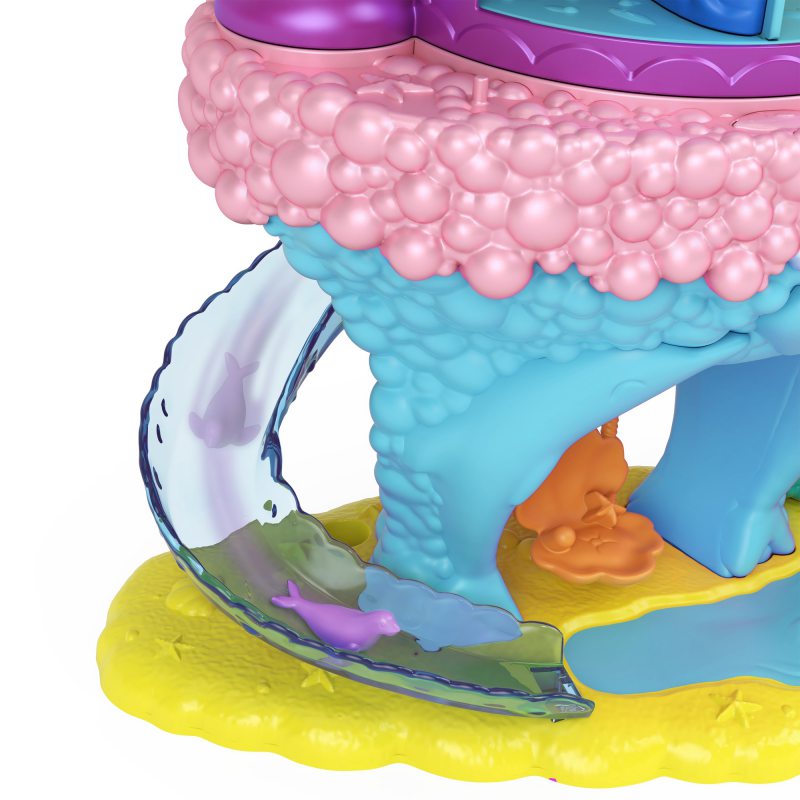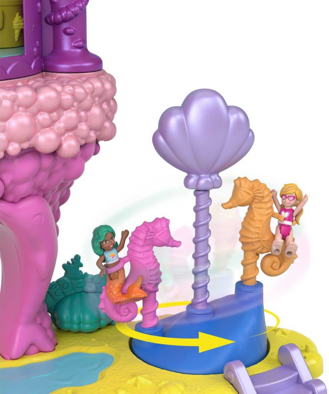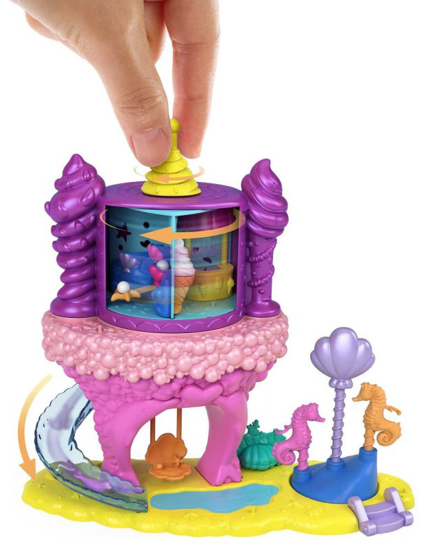 Podwodny morski lunapark z pewnością przypadnie do gustu niejednej małej dziewczynce i miłośniczce podwodnych przygód. Znajdziemy tu wiele atrakcji! Kolorowa wieża obraca się i wypuszcza 15 niespodzianek - załaduj akcesoria do wieży, aby bawić się wciąż od nowa. W zestawie znajduje się także ruchoma karuzela z konikami morskimi i wieża z kilkoma komnatami: sala gier, budka z lodami i muszelkowa komnata tronowa. Pobujaj się na huśtawce albo pomknij w dół zjeżdżalni! Zestaw zawiera także dwie laleczki, które mają punkty zgięcia do ustawiania w różnych pozach. Zanurz się w świecie podmorskiej zabawy z Polly Pocket. Lalki nie stoją samodzielnie.