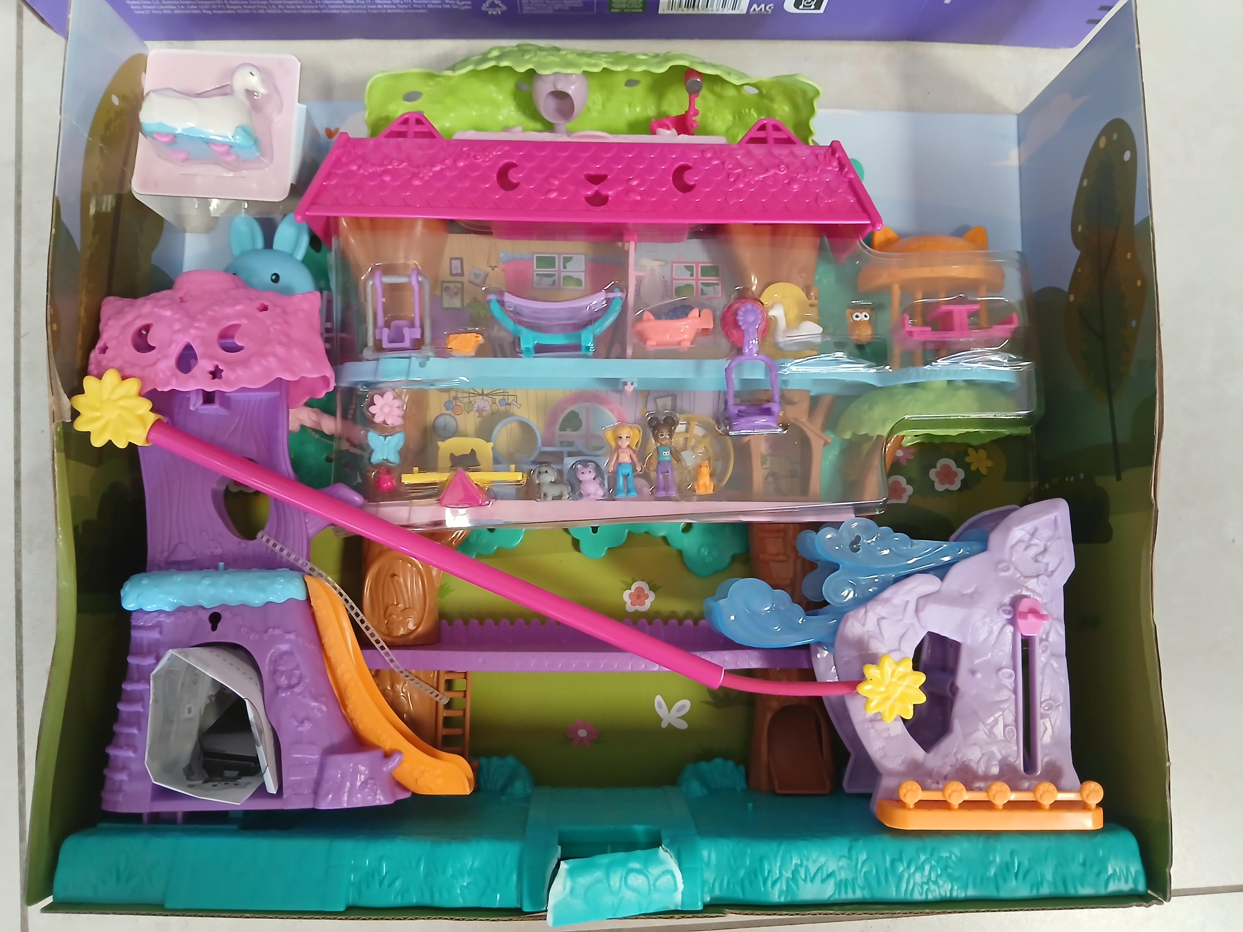 Domek na drzewie Polly Pocket skrywa w sobie rozmaite niespodzianki i pomysły na spędzenie czasu wraz ze zwierzątkami. Domek ma pięć pięter, w których znajdziemy mnóstwo ruchomych elementów. Możemy posadzić laleczkę i jej pupila w łabędzim pojeździe i wybrać się na przejażdżkę. Możemy również zafundować laleczką zjazd na tyrolce. W zestawie mamy 4 figurki uroczych zwierzątek oraz dwie laleczki.