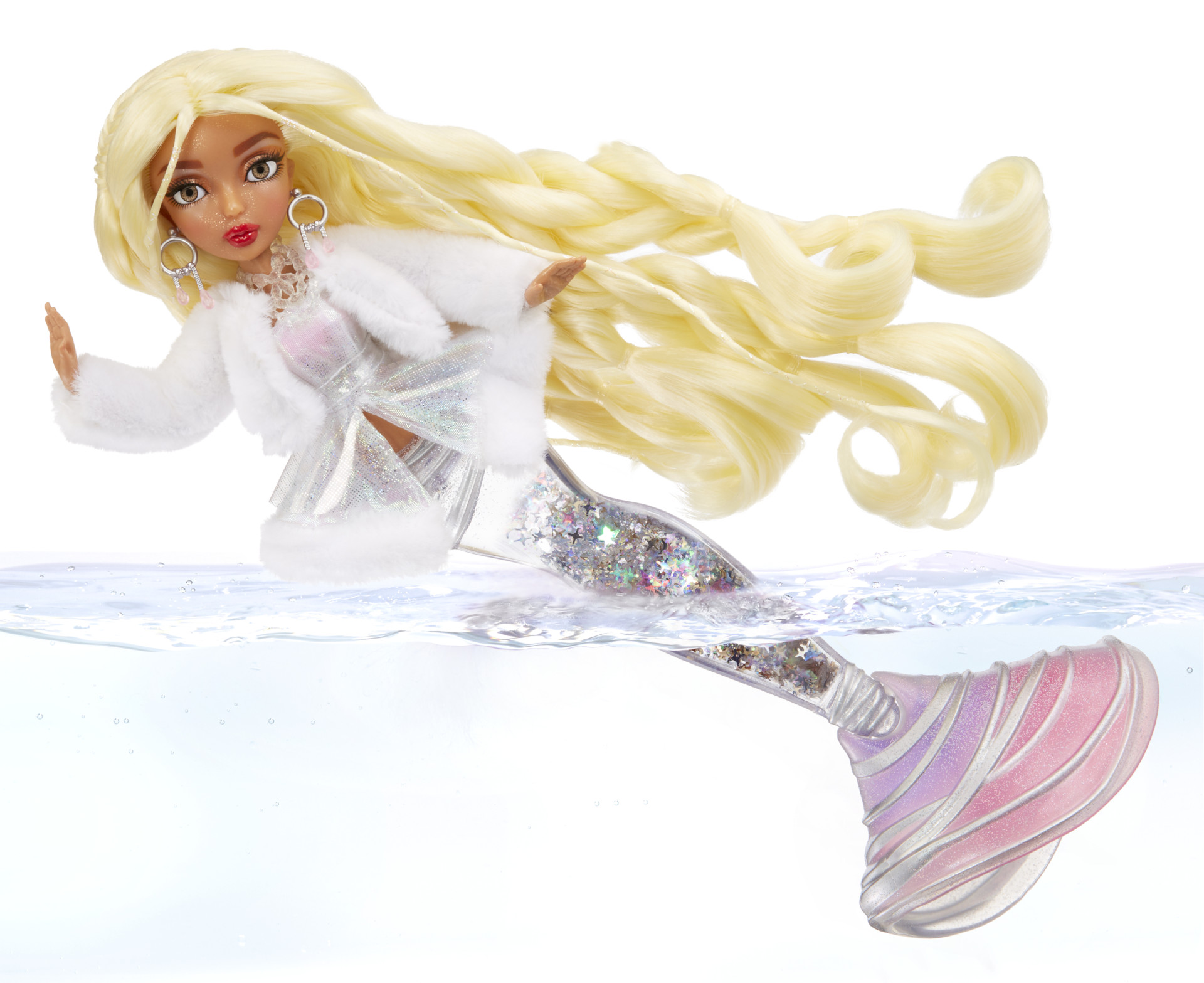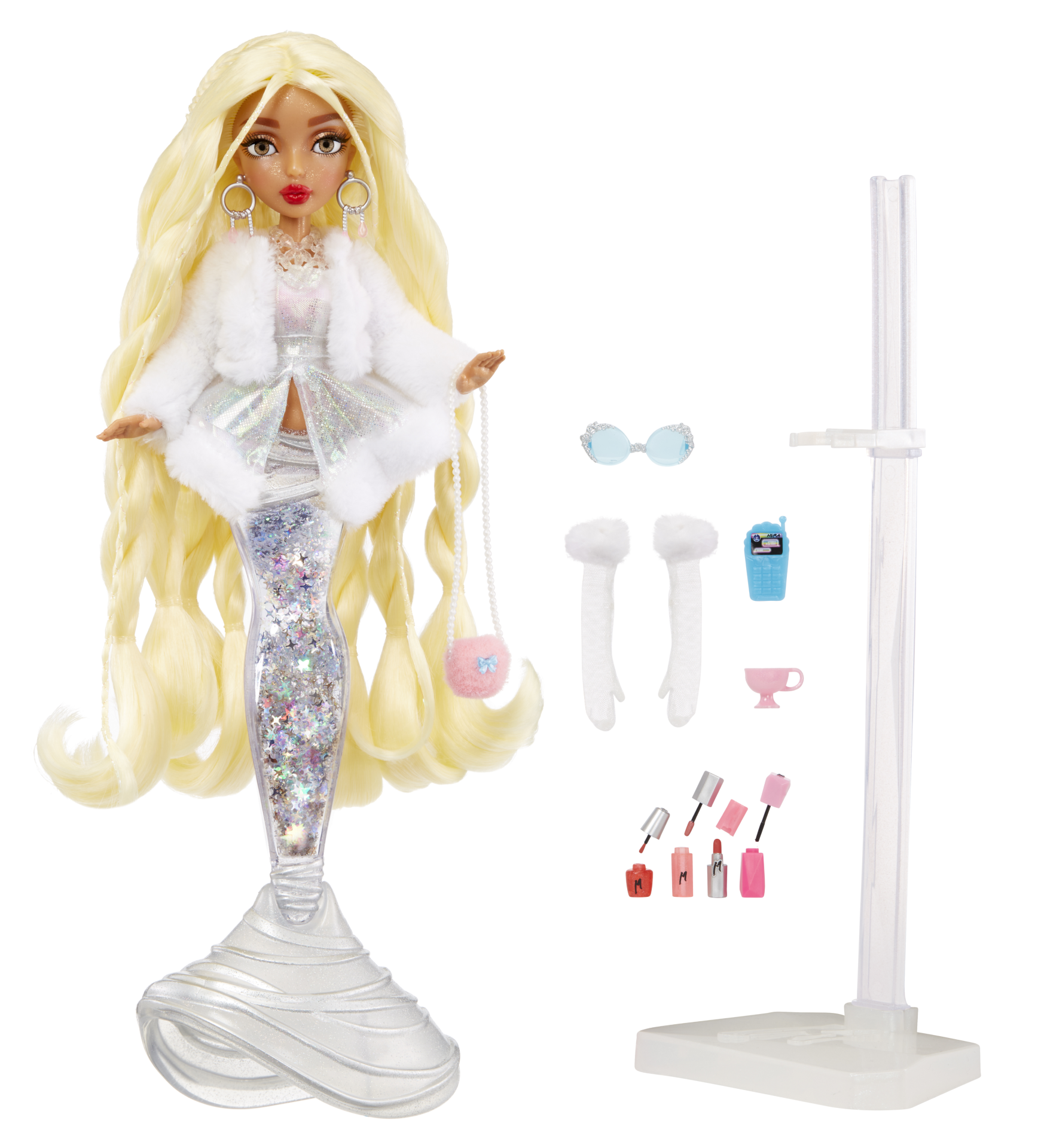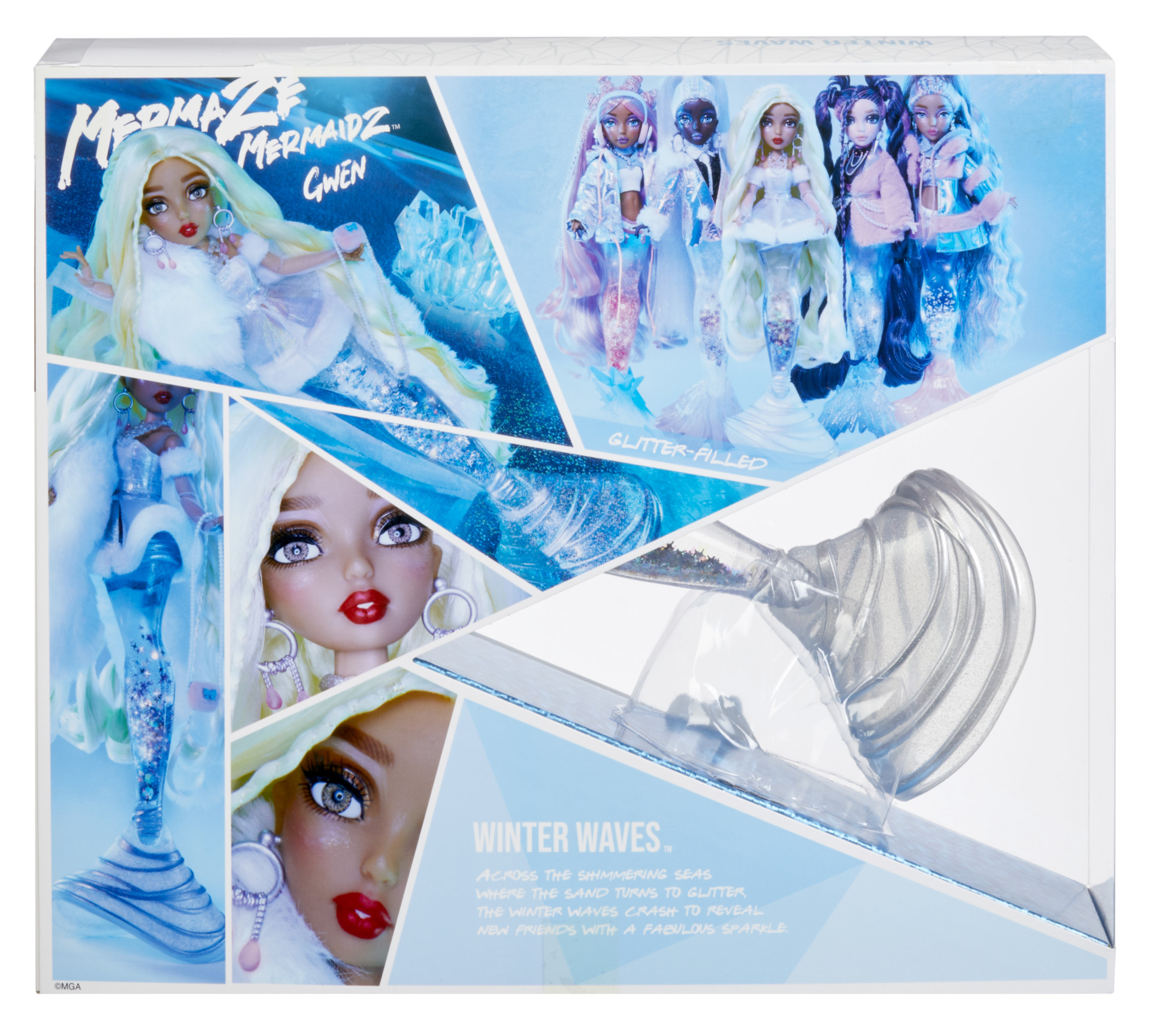 Każda lalka Mermaze Mermaidz Winter Waves ma hipnotyzujący, wypełniony brokatem ogon. Gwen ma srebrny brokat w kształcie 4-punktowej gwiazdy! Poruszaj nią kilka razy w górę i w dół, a zobaczysz jak brokat wiruje! Gwen posiada unikalną, specjalnie wyrzeźbioną płetwę, która dokonuje magicznej zmiany koloru po zanurzeniu w lodowatej wodzie. Jej płetwa zmienia kolor z błyszczącego metalicznego srebra na odcienie fioletu i różu! - Gwen ma na sobie opalizujący top bez ramiączek z białym wykończeniem z futra i siateczkowymi rękawami. Jej akcesoria to długie kolczyki, kolia z kryształów, okulary i futrzana torebka.