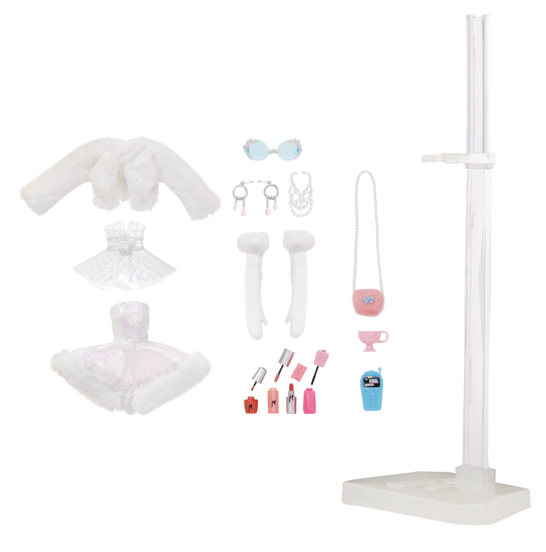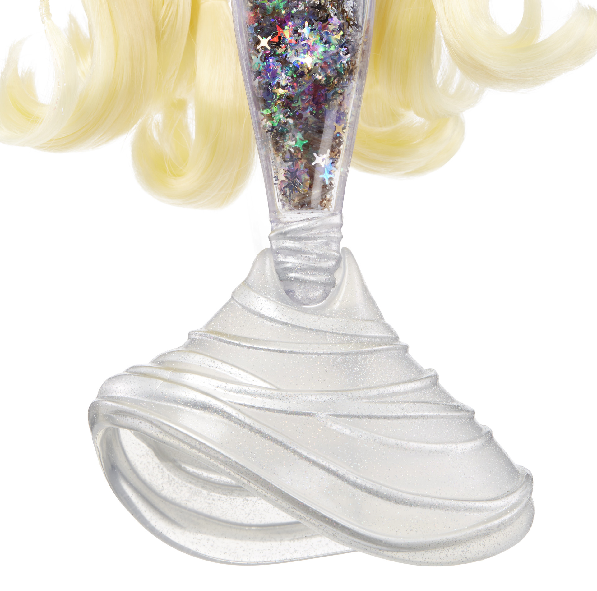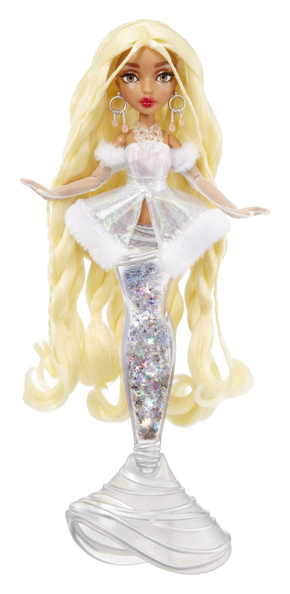 Każda lalka Mermaze Mermaidz Winter Waves ma hipnotyzujący, wypełniony brokatem ogon. Gwen ma srebrny brokat w kształcie 4-punktowej gwiazdy! Poruszaj nią kilka razy w górę i w dół, a zobaczysz jak brokat wiruje! Gwen posiada unikalną, specjalnie wyrzeźbioną płetwę, która dokonuje magicznej zmiany koloru po zanurzeniu w lodowatej wodzie. Jej płetwa zmienia kolor z błyszczącego metalicznego srebra na odcienie fioletu i różu! - Gwen ma na sobie opalizujący top bez ramiączek z białym wykończeniem z futra i siateczkowymi rękawami. Jej akcesoria to długie kolczyki, kolia z kryształów, okulary i futrzana torebka.