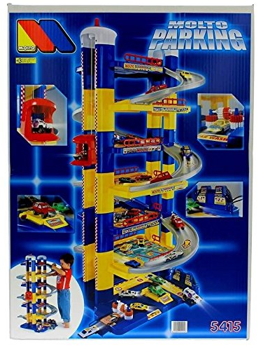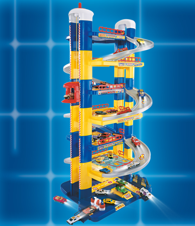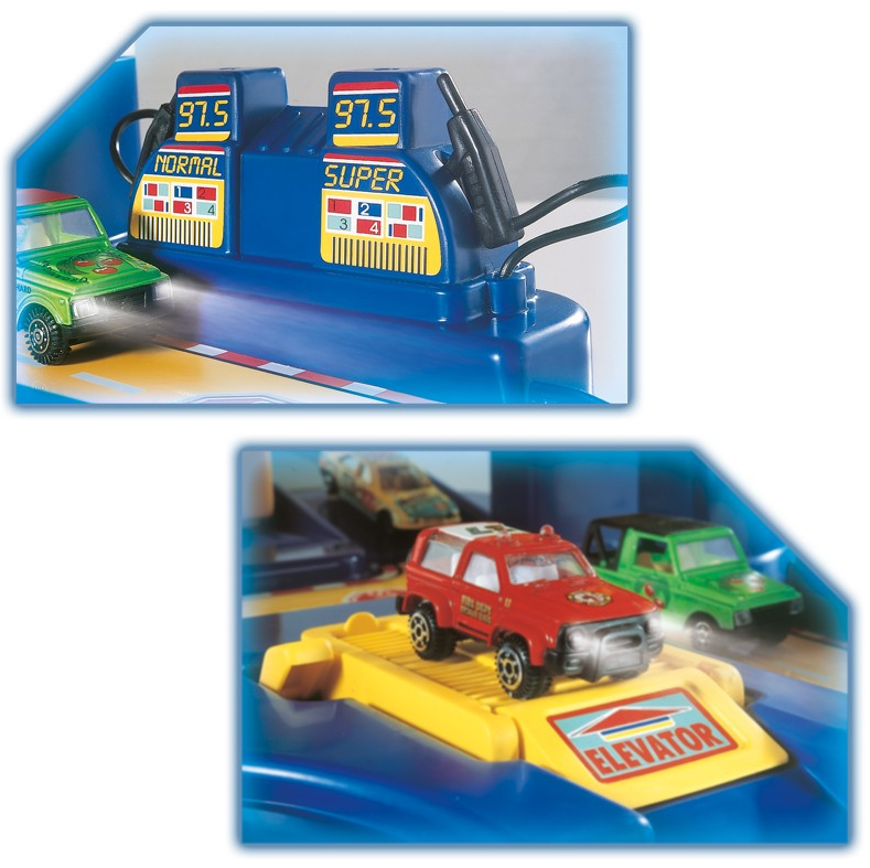 Garaż posiada stabilną konstrukcję, a jednocześnie jest bardzo łatwy w montażu. Po złożeniu można go przenosić jedną ręką bez obawy o konstrukcję. W zestawie liczne akcesoria: stacja benzynowa, myjnia samochodowa, podnośnik naprawczy dla samochodów. Samochody swobodnie przejeżdżają po całej trasie z góry na dół. Garaż wyposażony w ruchomą windą dla autek, podnoszoną i opuszczaną za pomocą pokrętła Wykonany w niebiesko żółtych kolorach. Stabilny i łatwy w montażu.