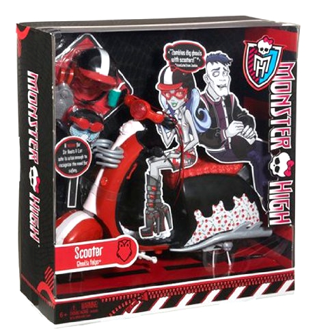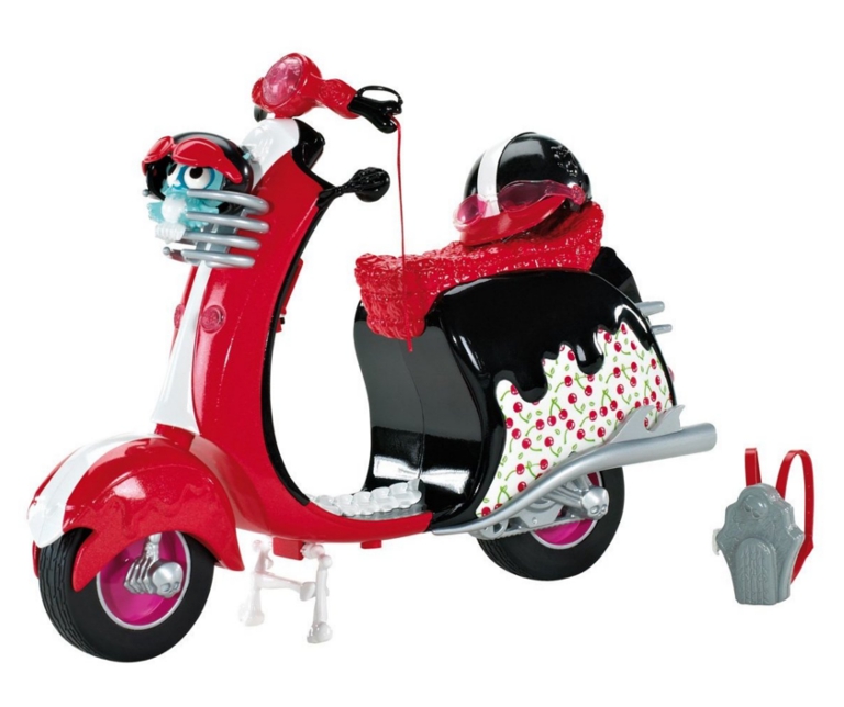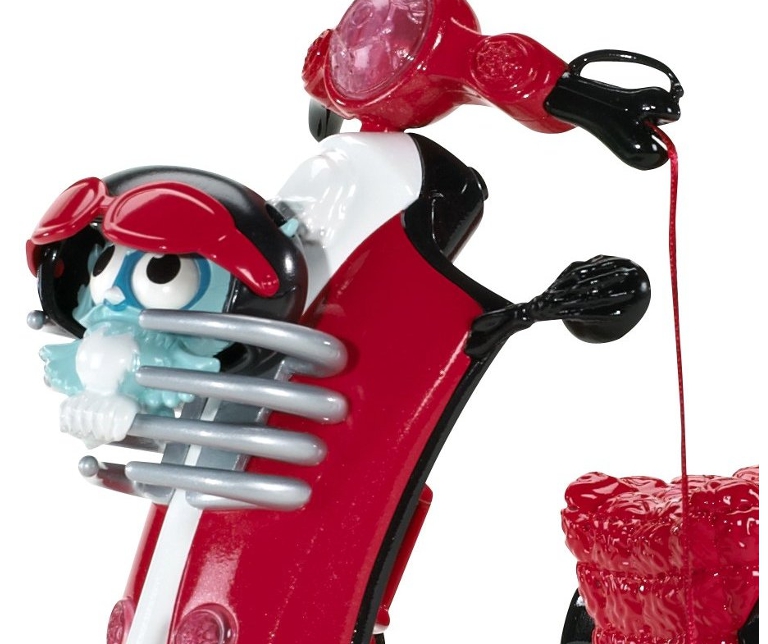 Bohaterka bajki o uczniach ze Straszyceum może teraz podróżować korzystając ze swojego upiornego nowego skutera. Ghoulia Yelps była dotąd wolno poruszającą się zombinką, ale na tym skuterze zacznie przemieszczać się znacznie szybciej! Konstrukcja jednośladu wraz z dodatkami utrzymana jest w modnej, mrocznej kolorystyce Monster High.