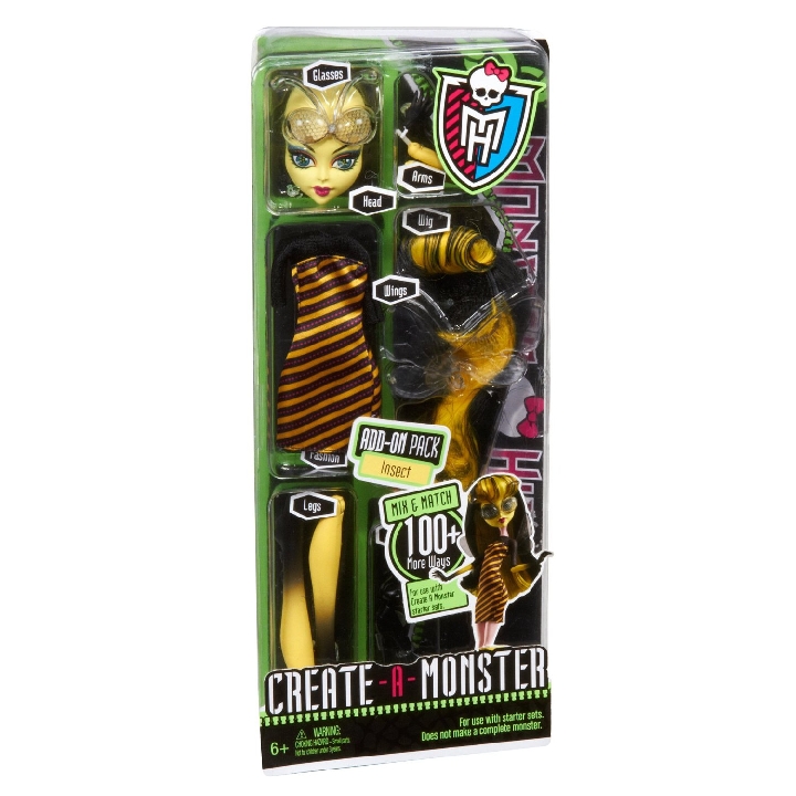 Doskonal się w sztuce tworzenia najbardziej wymyślnych upiorów. Pomogą Ci w tym dodatkowe, unikatowe zestawy z serii Stwórz Własnego Potwora Szkielet, Owad, Upiór z trzecim okiem! Każdy zestaw zawiera części lalki i akcesoria. Zestawy można łączyć miedzy sobą: zamieniaj głowy, dłonie, kości, czułki, peruki i twórz własne unikatowe kombinacje.
