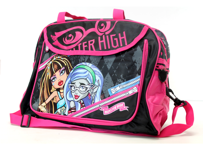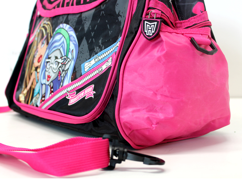 Idealna torba dla każdej miłośniczki Monsterek. Jej ogromnym atutem jest wielkość i pojemność jak prawdziwej torby sportowej, nadaje się na basen, zajęcia sportowe czy na wakacje. Główna przegroda zapinana jest na suwak, z boku są dwie kieszenie: np na butelką z napojem lub telefon komórkowy. Torbę mozna nosić w ręku lub na długim, dopinanym pasku. Dodatkowym plusem jest usztywniane dno oraz stopki zabezpieczające niszczeniu się spodu torby.