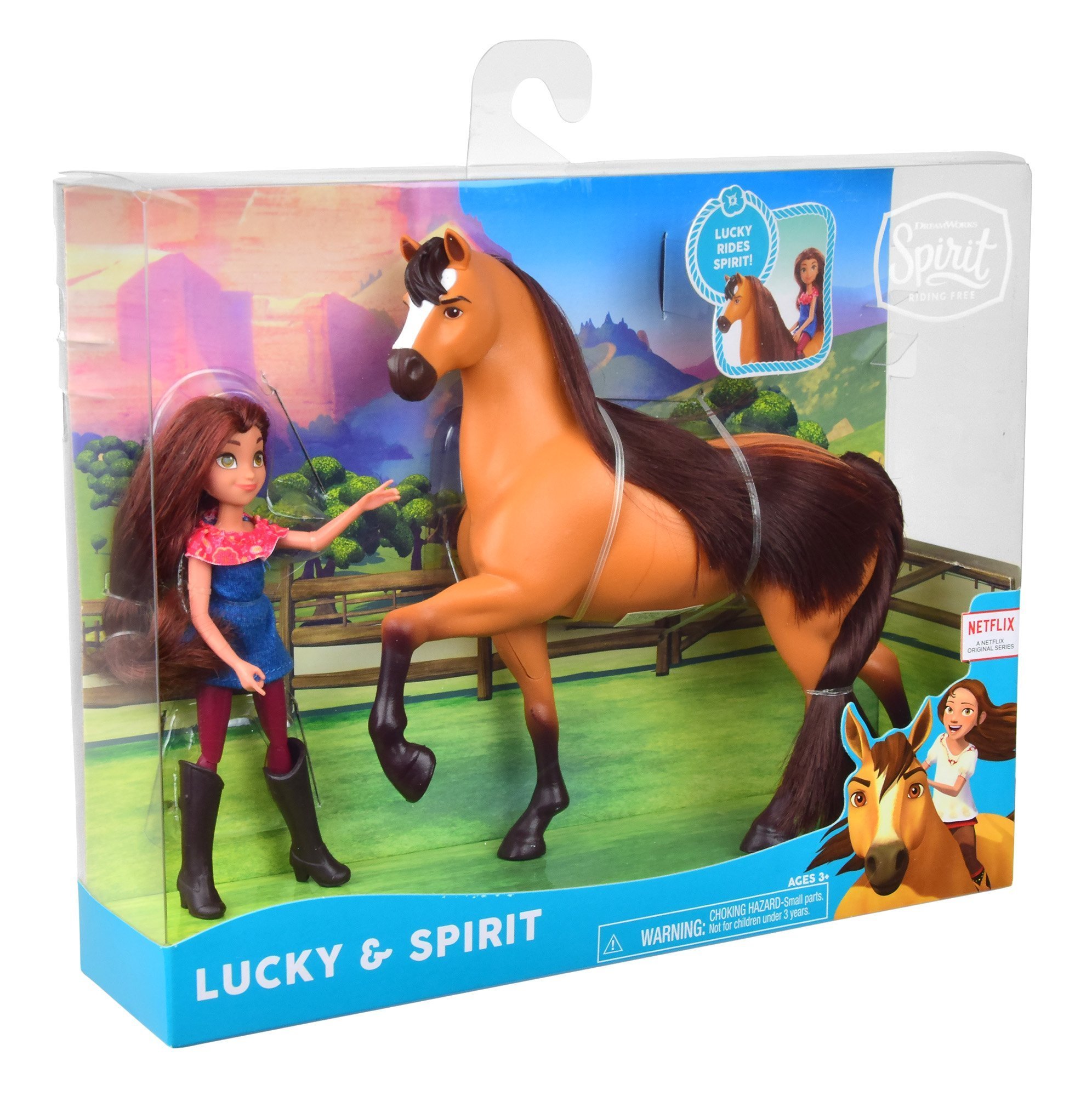 W zestawie znajduje się lalka przedstawiająca dziewczynkę o imieniu Lucky oraz figurka przedstawiająca jej klacz Spirit. Lalka Lucky ma śniadą cerę, długie, ciemno-brązowe włosy oraz wielkie brązowe oczy. Lucky ubrana jest w niebieską tunikę, ciemne leginsy oraz wysokie, czarne kozaki. Koń Spirit jest w kolorze jasnobrązowym z długą orzechową grzywą i ogonem do czesania. Koń może samodzielnie stać.