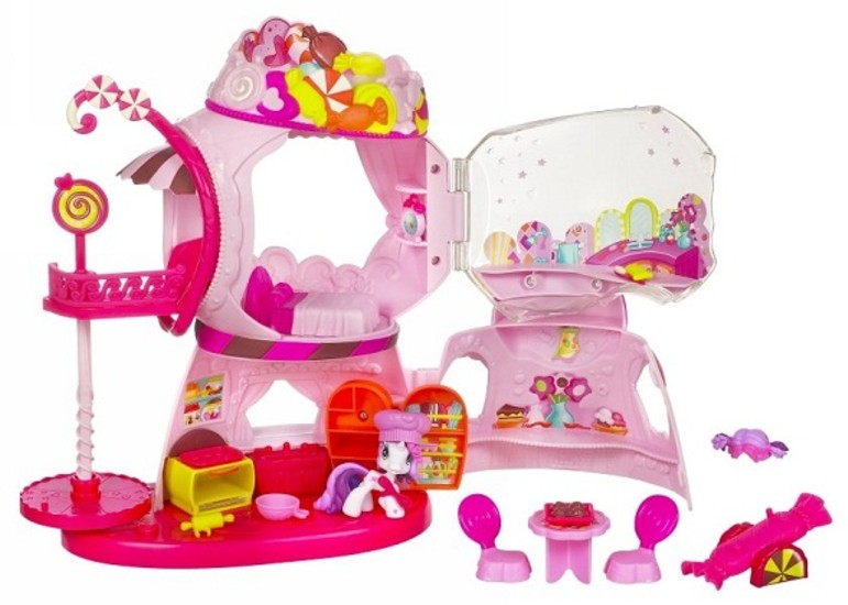 Rewelacyjny domek dla kucyków został wyposażony w mnóstwo fantastycznych akcesoriów. W zestawie znajduje się także prześliczny malutki kucyk Sweetie Belle, która uwielbia piec pyszne ciasteczka oraz zmieniać fryzury ! Balonowej zabawie towarzyszy wesoła muzyczka, którą uruchamia się po wciśnięciu serduszka znajdującego się na podstawie domku. Wymagane 3 baterie AAA (paluszki) są w zestawie.