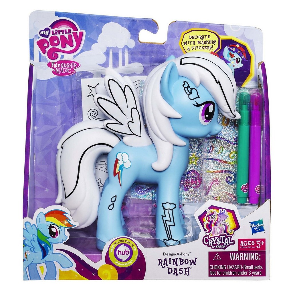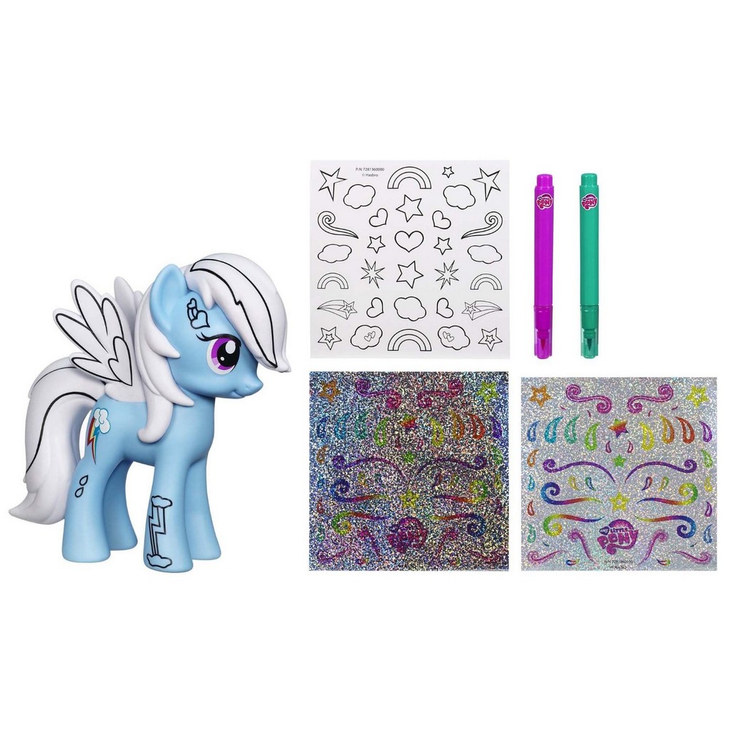 Teraz dziewczynki mogą stworzyć własnego, wymarzonego, błyszczącego kucyka! Dzięki Rainbow Dash, która czeka na nową stylizację każda młoda projektantka stworzy niepowtarzalne kucykowe arcydzieło. By tego dokonać dziewczynki mają do swojej dyspozycji kolorowe naklejki oraz specjalne flamastry, którymi można pokolorować chociażby grzywę Rainbow Dash.