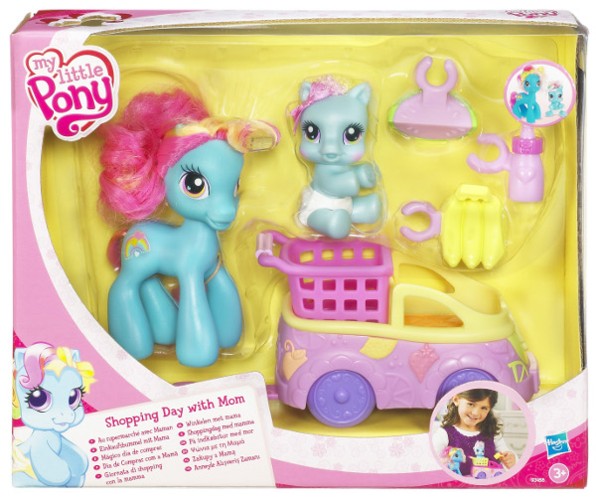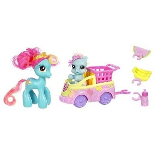 Malutki kucyk razem ze swoją mamą wybrali się na zakupy. By nie musieli dźwigać kupionych towarów zabrali ze sobą poręczny wózek. Posiada on specjalną platformę, w którą mama wkłada swoją nóżkę i dzięki temu może pchać wózek. Dodatkowo w zestawie znajdują się mini zakupy, które wybrały nasze pupilki.