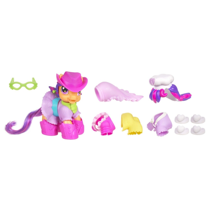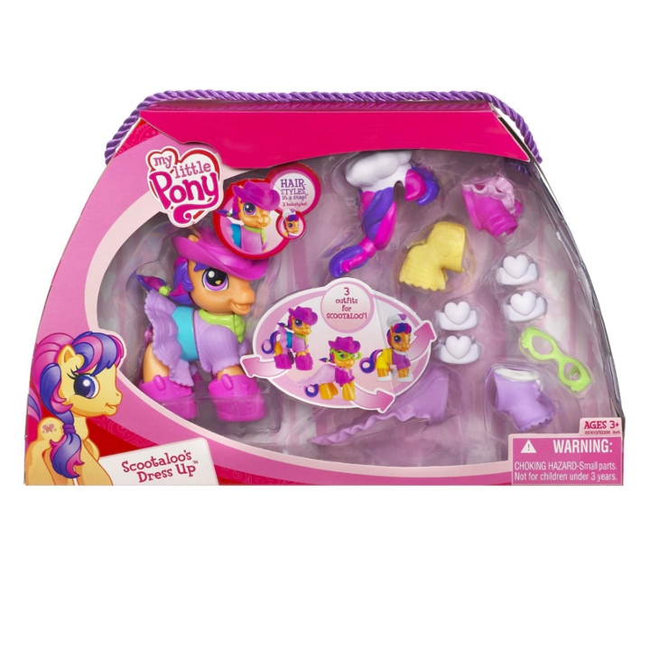 Scootaloo to prawdziwa modnisia. Uwielbia się przebierać i tworzyć coraz to nowsze kompozycje strojów. Do dyspozycji dziewczynek są różne fryzury, okulary, spódniczki, bluzeczki oraz buciki. Wszystkie ubranka są gumowe, dzięki czemu są łatwe do założenia dla małych rączek dziecka. Teraz dziewczynki mogą dowolnie miksować tworząc nowe wizerunki małej Scootaloo.