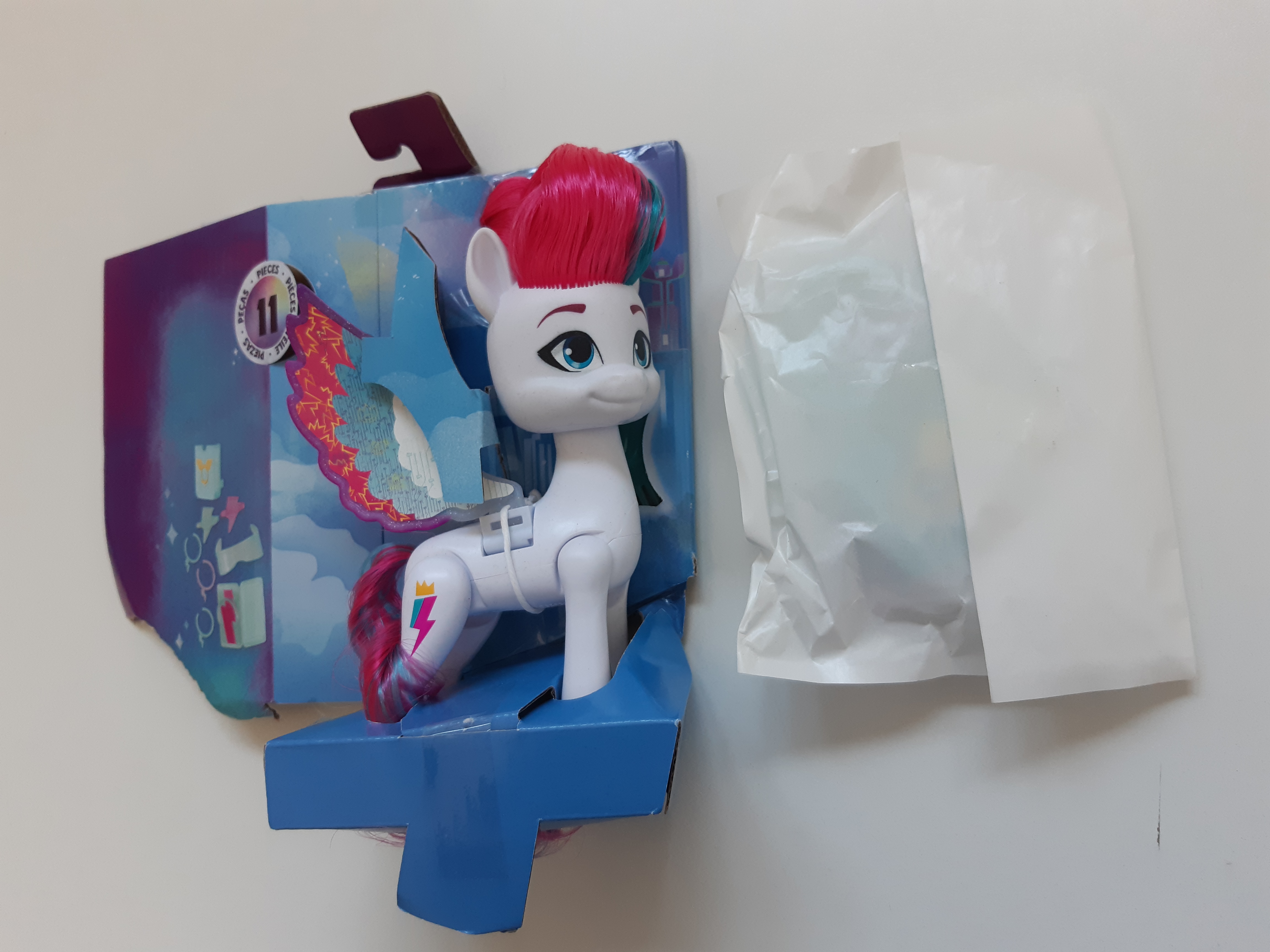 Odkryj magiczne sekrety z figurką My Little Pony Kucyk z magicznymi skrzydłami Zipp Storm! Zipp to zbuntowana księżniczka, która uwielbia rozwiązywać zagadki w serialu „My Little Pony: Opowiedz swoją historię”. Ściśnij tylne nogi konika, by zatrzepotał skrzydłami w górę i w dół. Wyobraź sobie, że Zipp wzbija się w przestworza! W zestawie z każdym kucykiem znajdują się tematyczne akcesoria inspirowane daną postacią, a także grzebyk do czesania ich długich, miękkich włosów. Zipp przygotowuje się do pracy detektywistycznej ze swoim szkłem powiększającym, torbą i tabletem. Sprawdź niespodzianki ukryte pod skrzydłami, takie jak tajemnicze wzory czy skradzione Cutie Marks!