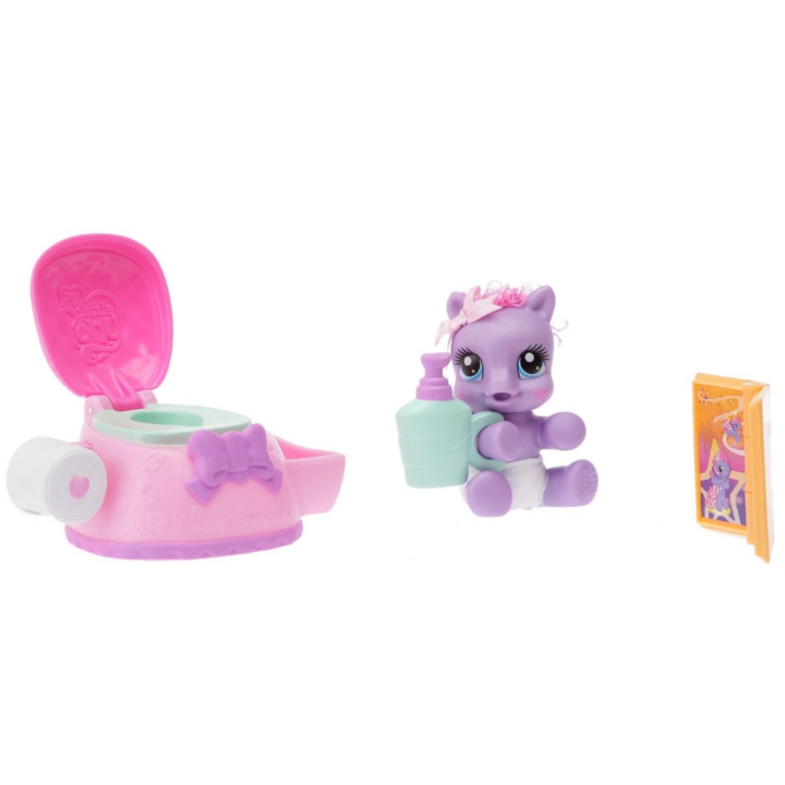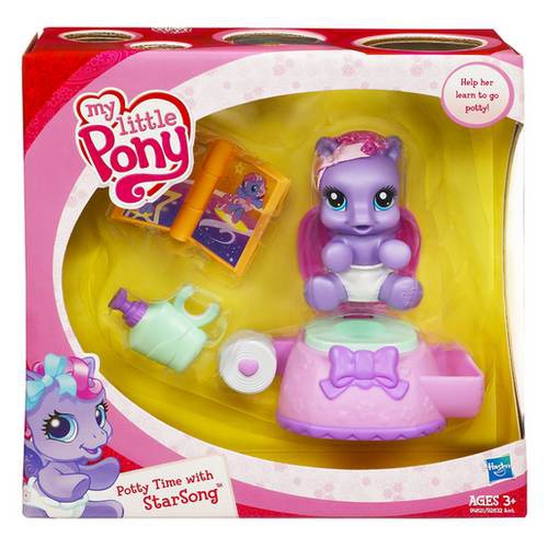 Nowonarodzony kucyk StarSong chce nauczyć się korzystać z toalety. Posadź tego słodkiego kucyka na nocniczku, podaj książeczkę i naucz go dbania o czystość. Dzięki całej gamie dodatków znajdujących się pudełku dziewczynki mogą sprawić, że mały StarSong zacznie samodzielnie korzystać z toalety!