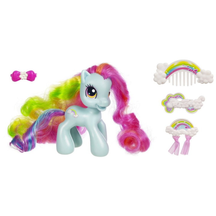 Zrób Rainbow Dash śliczną fryzurkę! Możesz zmieniać wygląd kucyka doczepiając i czesząc długie pasma włosów! W zestawie znajduje się także grzebień dla kucyka, którym dziewczynki będą mogły dowolnie stylizować fryzurę Rainbow Dash.