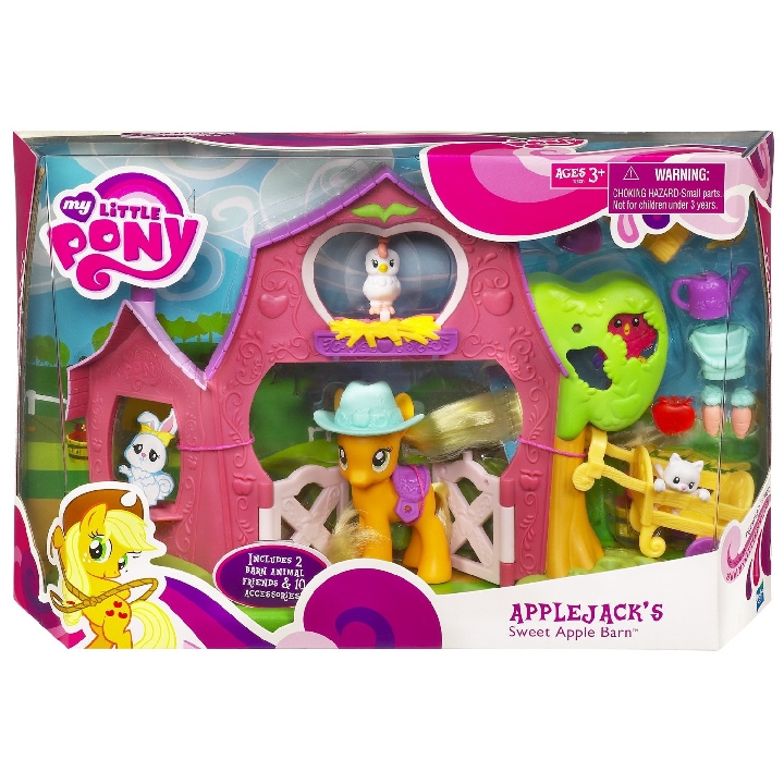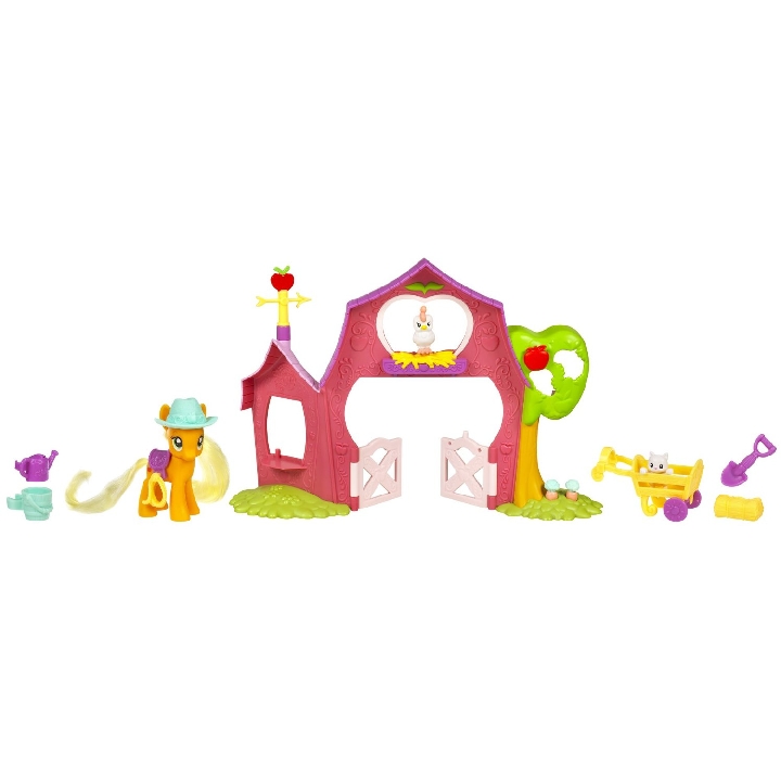 Kolorowy zestaw przedstawia zagrodę w której znajduje się uroczy kucyk Pony. Zajrzyj do zagrody Applejacka, który mieszka na wsi. Podlej roślinki zawieź siano do stodoły na specjalnym wózku. Razem z kurką i kotkiem kucyk Applejack wprowadzi dziewczynki w tajniki życia na wsi. Pomóż im z codziennymi sprawunkami, którymi zwierzątka zajmują się w zagrodzie!