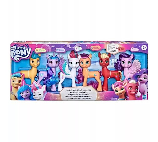 Zestaw składa się z 6 dużych figurek kucyków, o wielkości ok. 18 cm. Figurki mają ruchome głowy oraz długie, miękkie ogony, które można czesać. Dołącz do grupy przyjaciół i przezywaj z nimi niesamowite przygody.