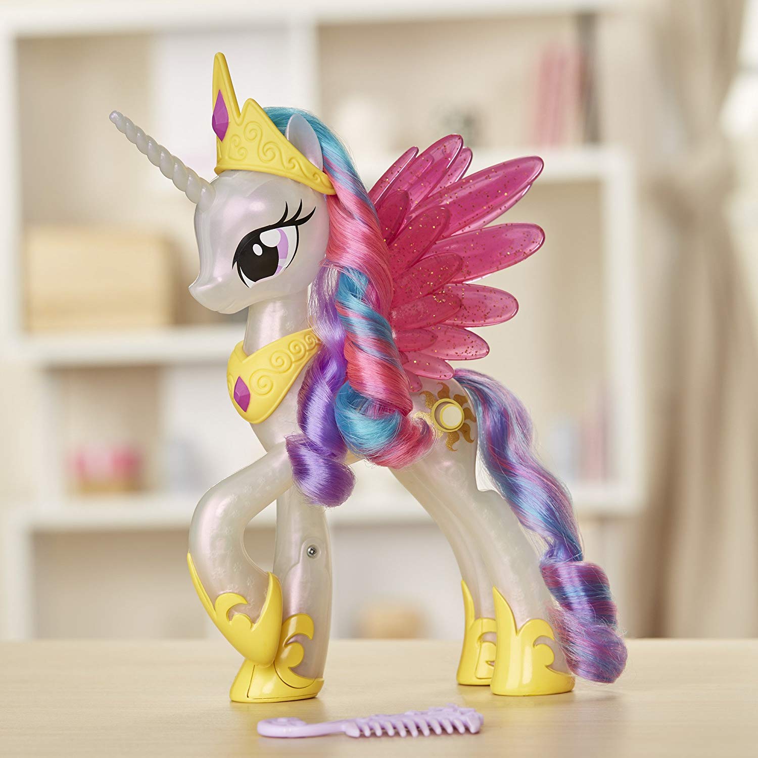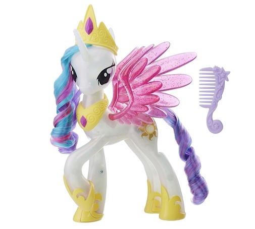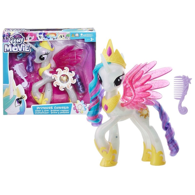 My Little Pony Księżniczka Celestia E0190 to figurka wzorowana na bajce dla dzieci My Little Pony, w której przeurocze tęczowe kucyki mieszkają w krainie Equestria. Księżniczka Celestia jest władczynią wszystkich kucyków, jest pogodna i sprawiedliwa a w dodatku bardzo piękna. Na ciele posiada znak słoneczka, gdy go naciśniesz jej ciało rozbłyśnie milionem kolorów. Dzięki grzebieniowi możesz wyczekać jej piękną wielobarwną długą grzywę i ogon. Celestia może również latać dzięki przepięknym ruchomym świecącym skrzydłom.