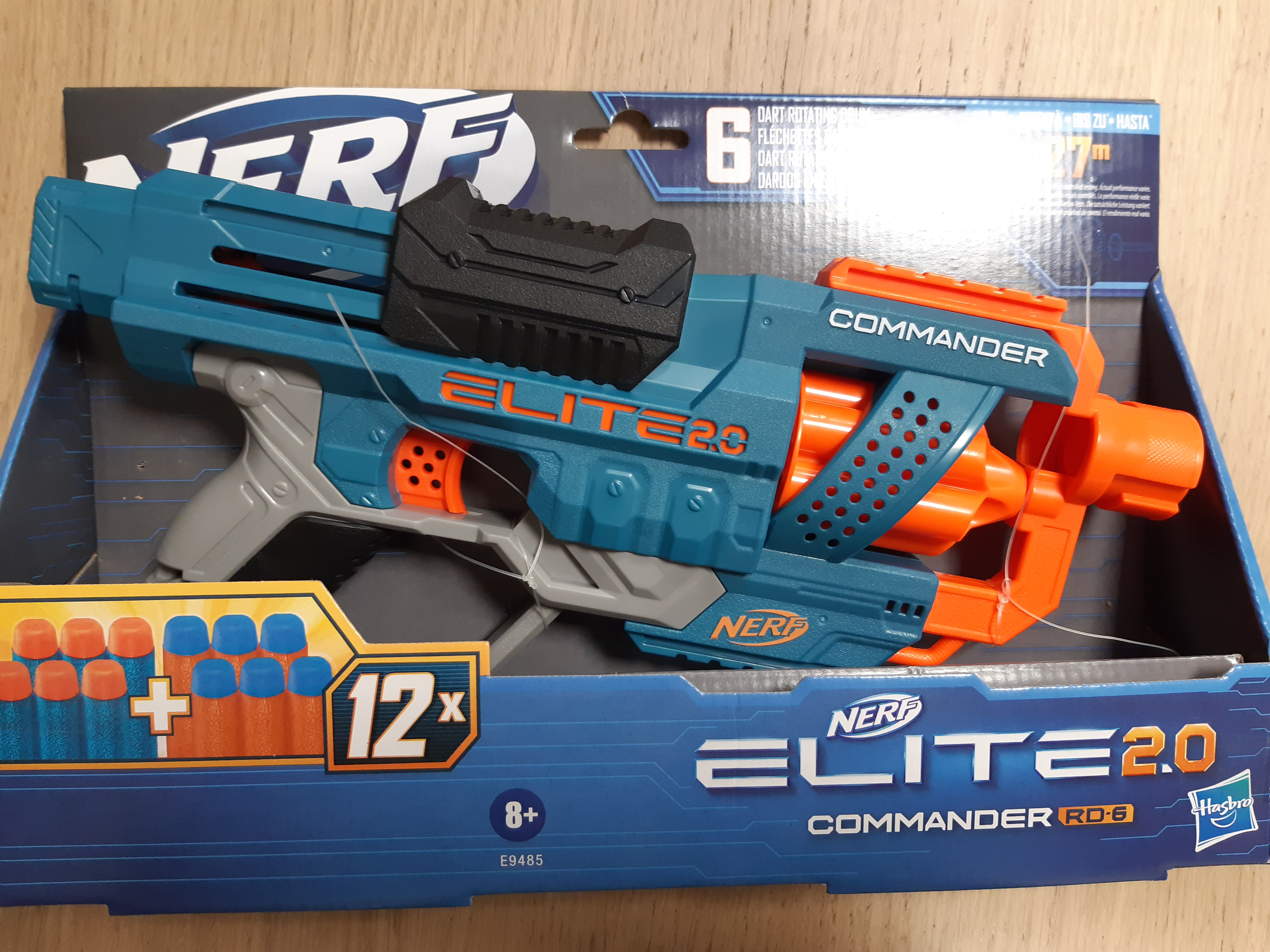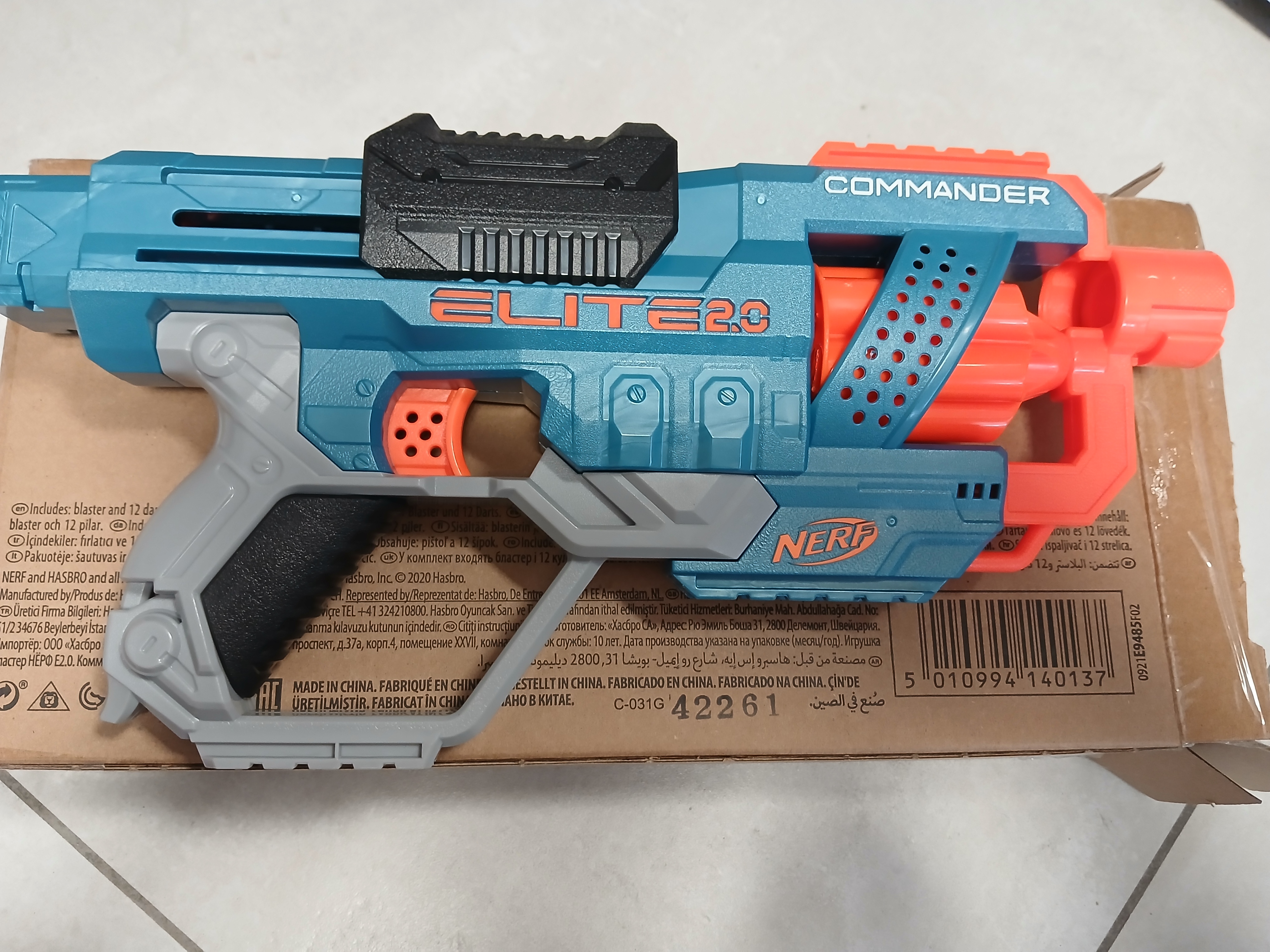 Commander to uniwersalna i łatwa w obsłudze wyrzutnia z obrotowym magazynkiem na 6 strzałek, która swoim wyglądem przypomina rewolwer. Commander jest następcą Disruptora czyli jednej z najpopularniejszych wyrzutni Nerf. Podobnie jak w Disruptorze mamy tutaj 2 tryby strzału: pojedynczy strzał oraz ciągły ogień, dzięki któremu możemy wystrzelić cały magazynek jedną serią. Wyrzutnia posiada także bardzo dobry zasięg dochodzący do 27 metrów. Commander to wyrzutnia kompletna oprócz tego, że świetnie strzela to mamy tutaj duże możliwości modyfikacji. Wyrzutnia posiada 3 szyny taktyczne, możliwość dołączenia przedłużenia lufy oraz uchwyt na kolbę. Dodatkowo w zestawie otrzymujemy 12 strzałek czyli 2 razy więcej niż pomieści magazynek.