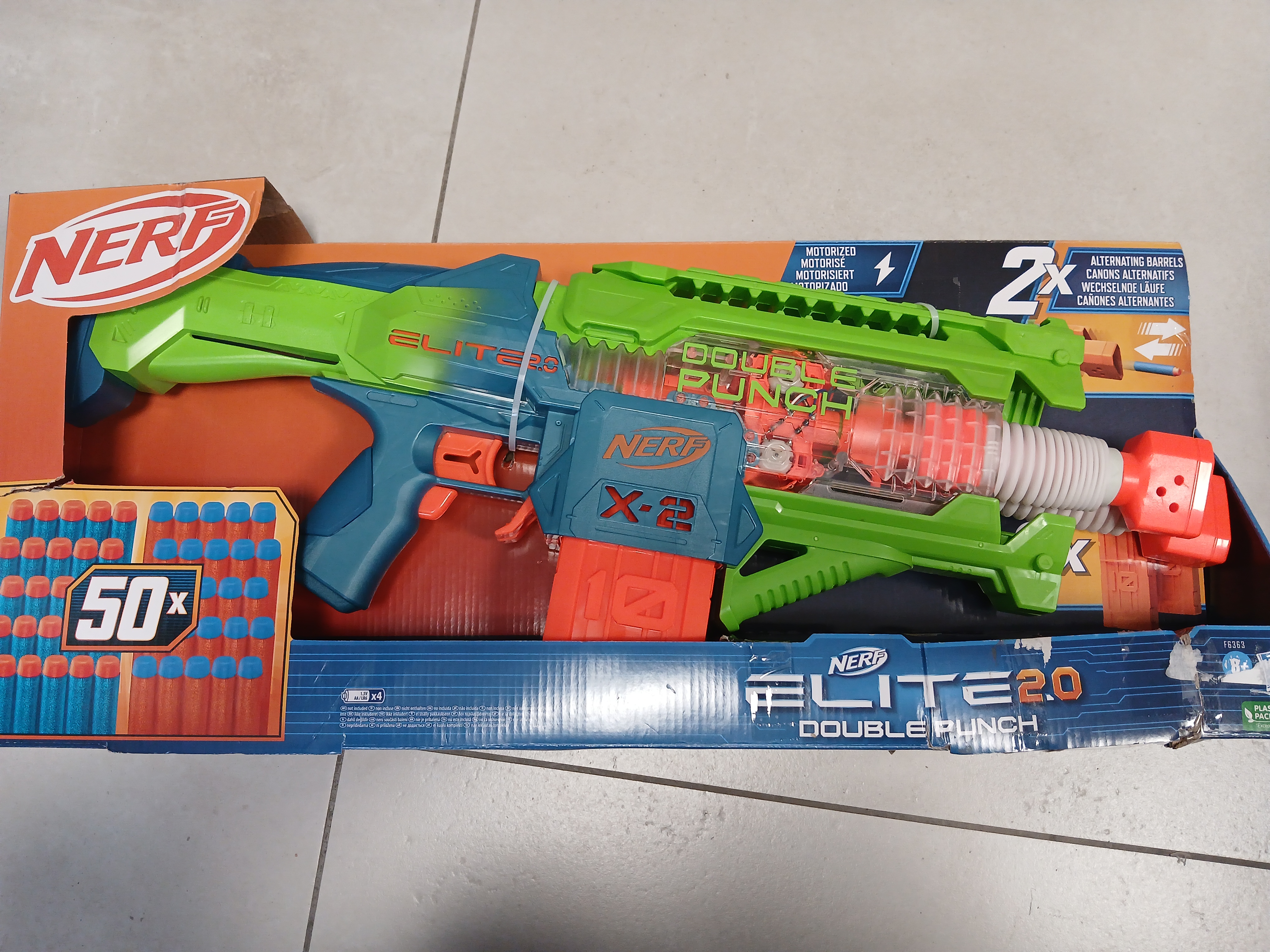 Double Punch to półautomatyczna wyrzutnia z dwoma poruszającymi się lufami oraz dwoma 10-strzałkowymi magazynkami z systemem clip, dzięki którym mamy dużą przewagę nad przeciwnikiem. W zestawie znajduje się aż 50 strzałek w dwóch kolorach. Na górze wyrzutni znajduje się szyna taktyczna, a pod nią uchwyt na strzałki. Uchwyt pomieści 10 standardowych strzałek typu elite. Dzięki podwójnej lufie oraz podwójnym magazynkom zyskujesz przewagę nad przeciwnikiem. Podczas oddawania strzału naboje są pobierane z magazynków na zmianę. Podobnie jest z lufami - naboje wylatują z luf na zmianę. W ten sposób bardzo szybko pokonasz swojego przeciwnika na polu bitwy. Szybkość strzału zelży od tego, jak szybko potrafisz naściskać na spust.