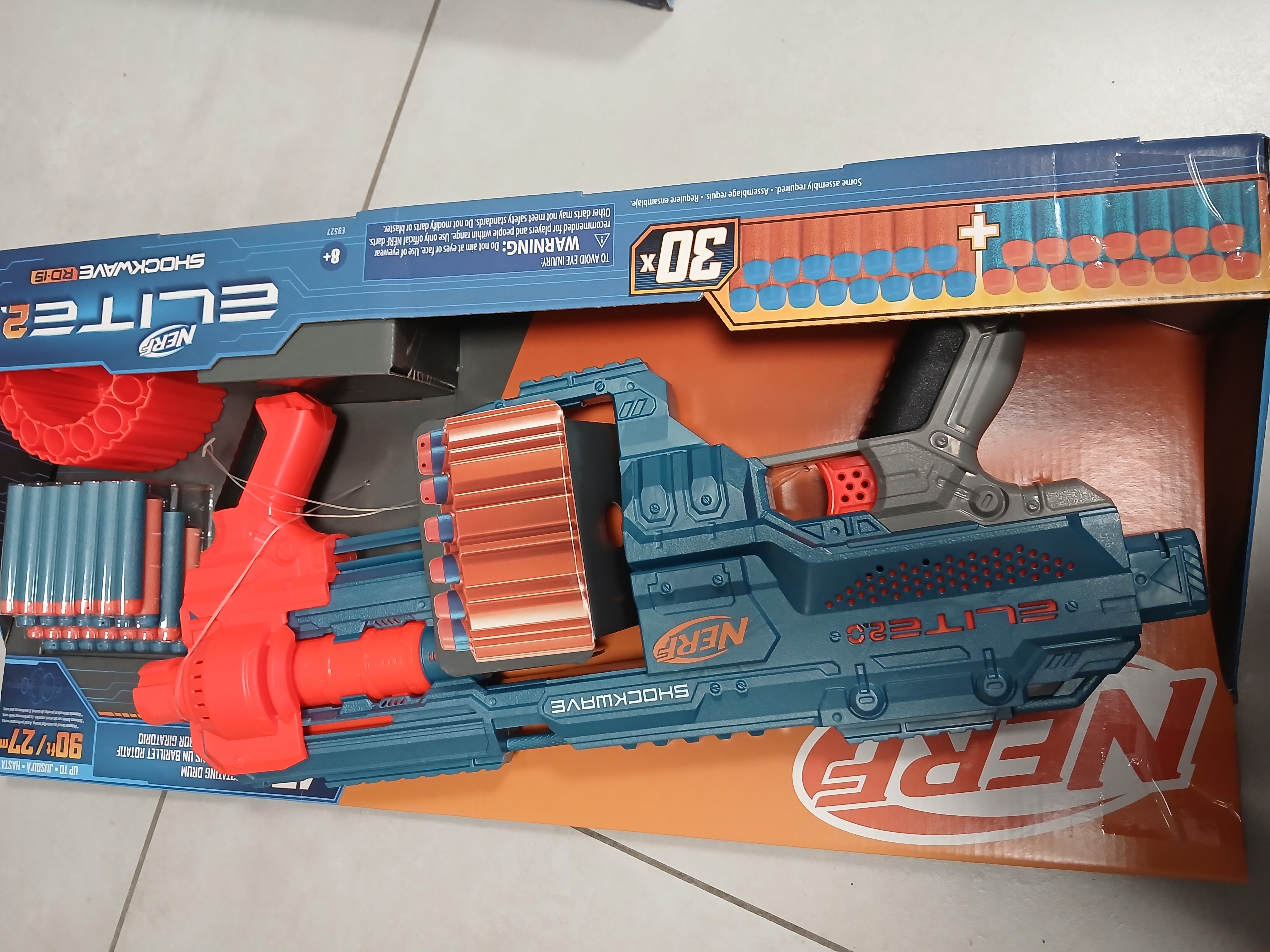 Nerf Shockwave to przeładowywana ręcznie wyrzutnia z obrotowym bębenkowym magazynkiem na 15 strzałek, który ma wiele podobieństw do wyrzutni Nerf N-Strike Elite Surgefire i którego można nazwać następcą tej wyrzutni. Maksymalny zasięg wyrzutni to ok. 27 m. W magazynku znajduje się aż 15 strzałek, a tak duża ich ilość pozwoli Ci uzyskać znaczną przewagę nad przeciwnikiem. Wyrzutnia Nerf Elite 2.0 Shockwave posiada nowoczesny design, który spodoba się każdemu chłopcu. Wyrzutnia posiada punkt mocowania przedłużenia lufy, z tyłu wyrzutni znajduje się punkt mocowania kolby. Shockwave posiada trzy szyny taktyczne, dwie na górze wyrzutni i jedną na dole. Złap szybkostrzelną wyrzutnię i zyskaj przewagę nad przeciwnikami!