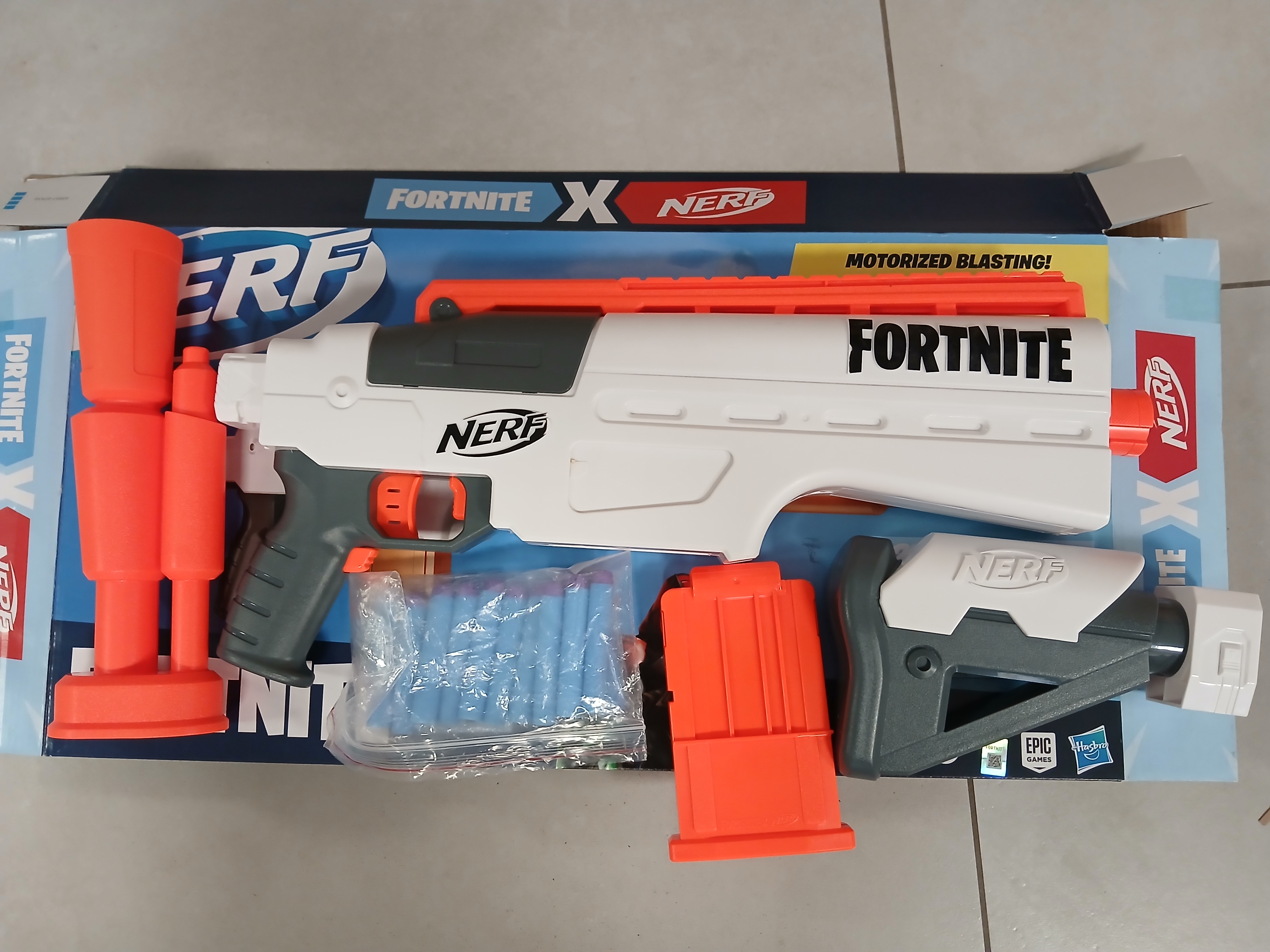 Nerf Fortnite IR to niesamowite połączenie świata Nerf i Fortnite Jest to półautomatyczna wyrzutnia zasilana na 4 baterie AA. By wystrzelić wystarczy włączyć silniki a następnie wcisnąć spust - każde wciśnięcie spustu to jeden strzał. Jest to również wyrzutnia modułowa którą możemy łatwo modyfikować i dostosować do każdej misji. Mamy tu odczepianą kolbę oraz lufę, a dodatkowo na górze wyrzutni znajduje się długa szyna taktyczna na dodatki Nerf. W zestawie otrzymujemy również magazynek Nerf na 6 strzałek oraz 12 strzałek Nerf Fortnite.