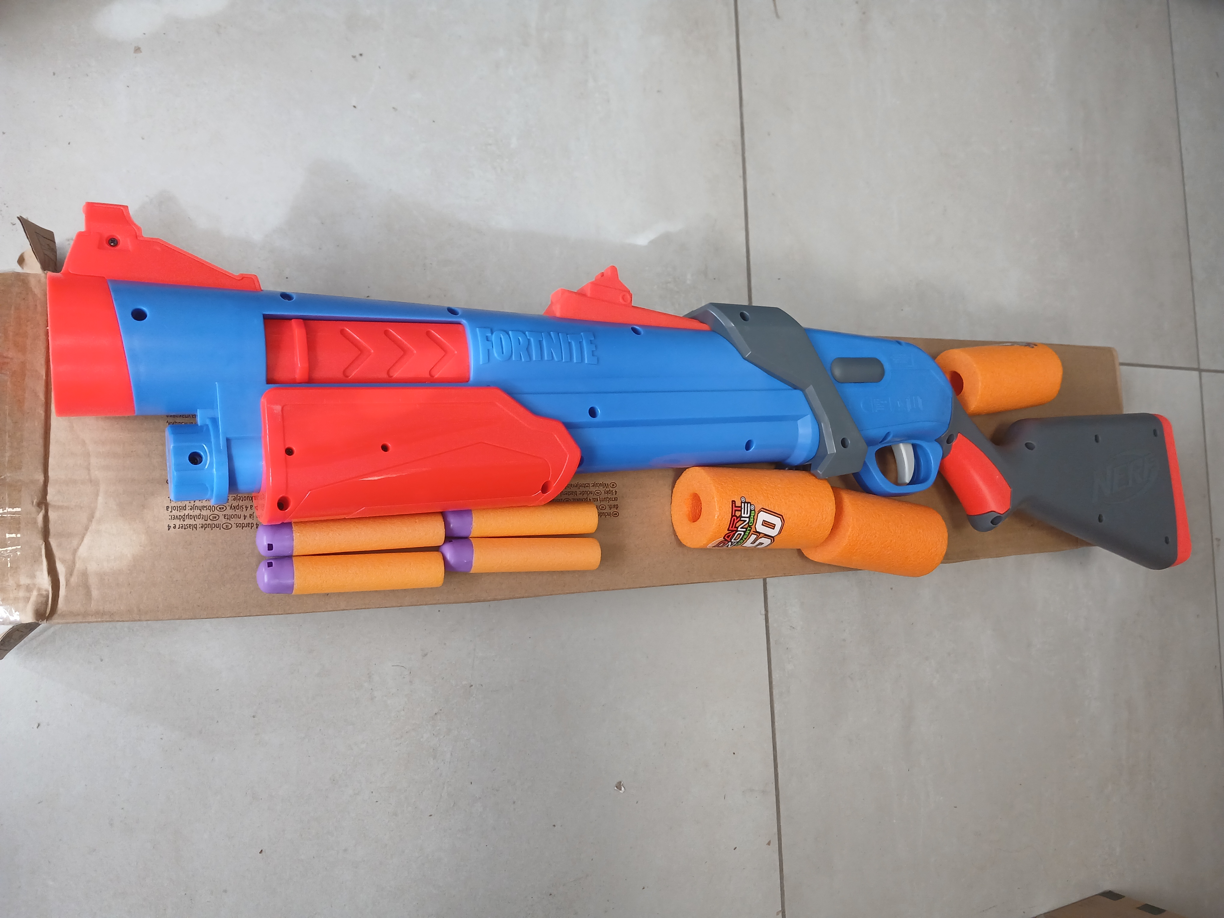 Wyrzutnia wzorowana jest na wyposażeniu z gry Fortnite. Stylizowany na Shotgun ponad 80-centymetrowy Pums SG na strzałki Mega jest prosty w użyciu i efektywny w strzelaniu. Aby załadować wyrzutnię, należy przesunąć czerwony uchwyt do przeładowywania do tyłu, aby otworzyć magazynek. Pojedynczą strzałkę ładujemy z boku wyrzutni. Następnie przesuwamy czerwony uchwyt do przodu i naciskamy na spust. W zestawie znajdują się 4 pomarańczowe strzałki Mega z fioletową końcówką, zaprojektowane do linii Fortnite, które pasują również do wszystkich wyrzutni serii Nerf Mega. Z wyrzutnią Pump SG dzieci mogą przenieść rozgrywkę z gry do realnego świata!