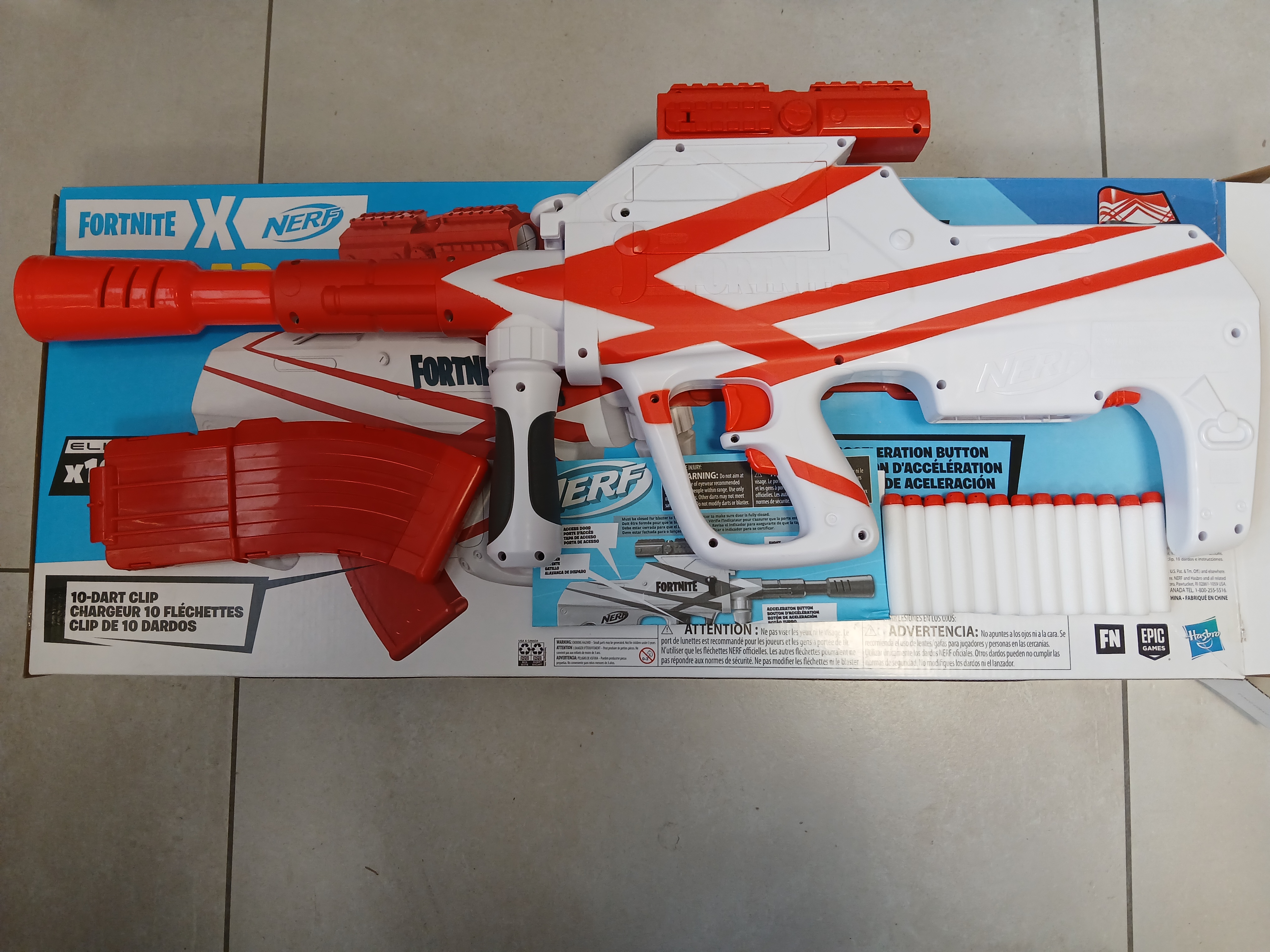 NERF Fortnite B-AR AUG powstał na bazie miotacza z niesamowicie popularnej gry Fortnite. To pół-automatyczna wyrzutnia, zasilana na 4 baterie typu C, dzięki czemu możemy błyskawicznie wystrzelić cały 10 strzałkowy magazynek. Wystarczy rozpędzić silniki i nacisnąć spust by oddać strzał. Na górnej części wyrzutni znajduje się celowniki, a na celowniku 3 szyny taktyczne na które możemy dołączyć dodatki. Łap za wyrzutnię i przenieś się z gry do świata rzeczywistego!