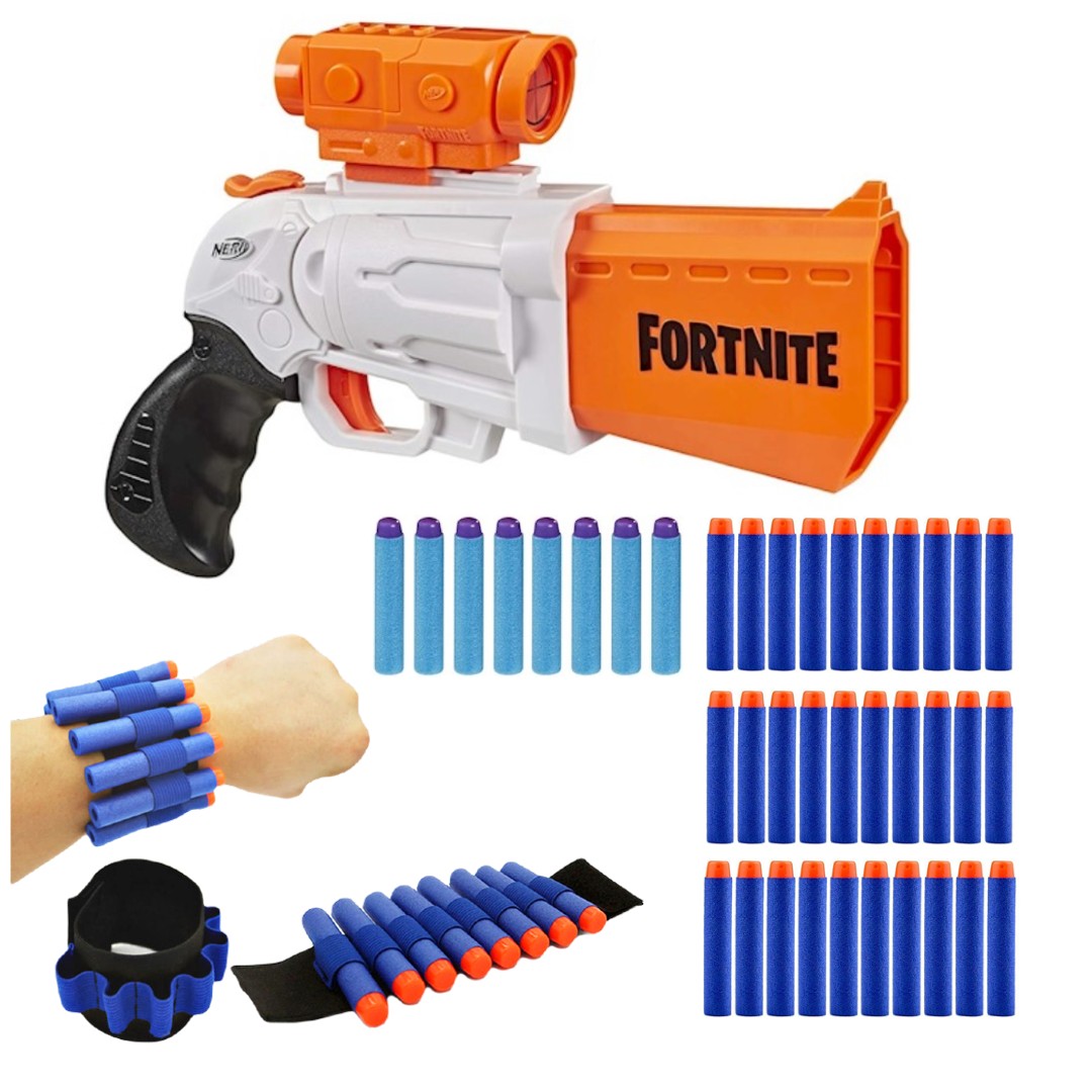 Nerf Fortnite SR Pistolet Rewolwer z Celownikiem E9391 + opaska + 30 strzałek