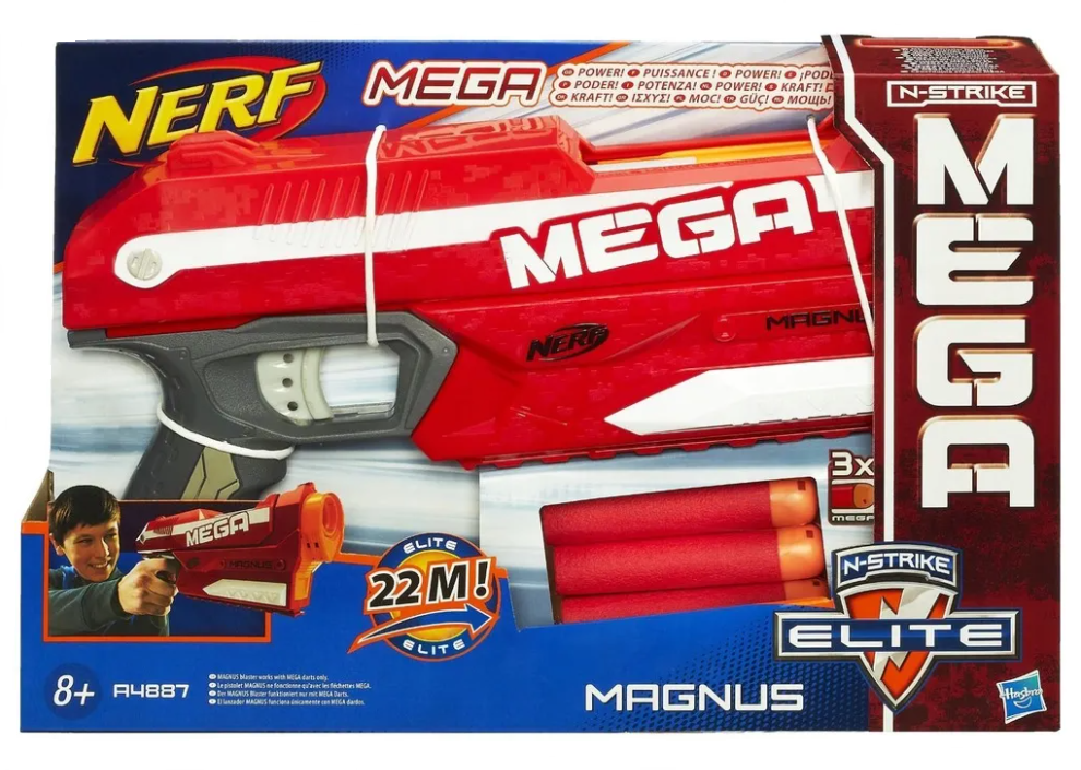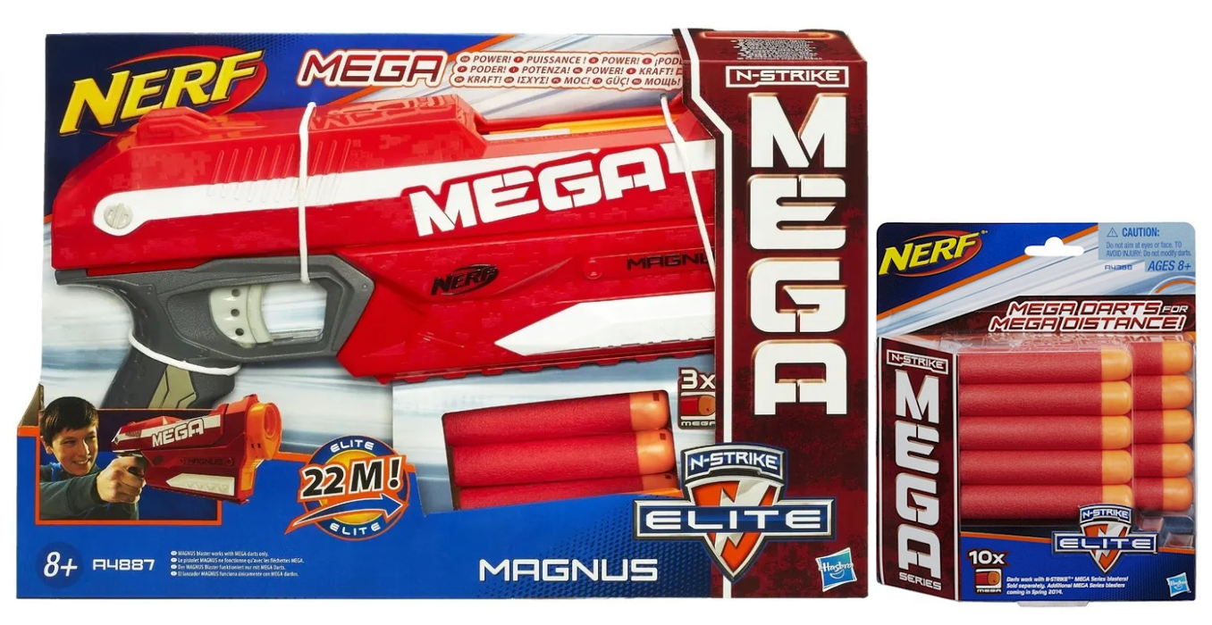 Magnus to wyrzutnia z serii Mega z zasięgiem do 25 metrów, której premiera odbyła się w 2014 roku. Blaster korzysta z powiększonych strzałek typu Mega, które zdecydowanie głośniej niż mniejsze strzałki gwiżdżą w locie. Ta jednoręczna wyrzutnia posiada wewnętrzny magazynek na trzy strzałki, które ładujemy od góry. Magnus to wyrzutnia która nie wymaga baterii. By go przeładować, wystarczy pociągnąć górną część wyrzutni do przodu i do tyłu.