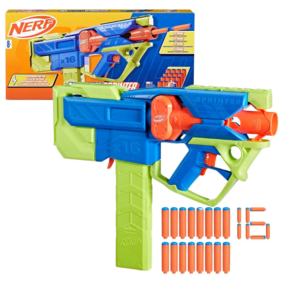 Przenieś swoje bitwy Nerf na zupełnie nowy poziom dzięki serii Nerf N Series i rewolucyjnym strzałkom N1! Nowoczesna wyrzutnia Sprinter oferuje szybkostrzelne, automatyczne strzelanie – wystarczy przytrzymać spust zasilania, a silnik rozpędzi strzałki z niesamowitą prędkością! Strzałki Nerf N1 zapewniają ekstremalną celność, szybkość i zasięg, co czyni tę wyrzutnię idealnym wyborem do dynamicznych bitw. Wyrzutnia Sprinter zawiera wyjmowany magazynek na 16 strzałek N1 oraz pełen komplet 16 strzałek N1.