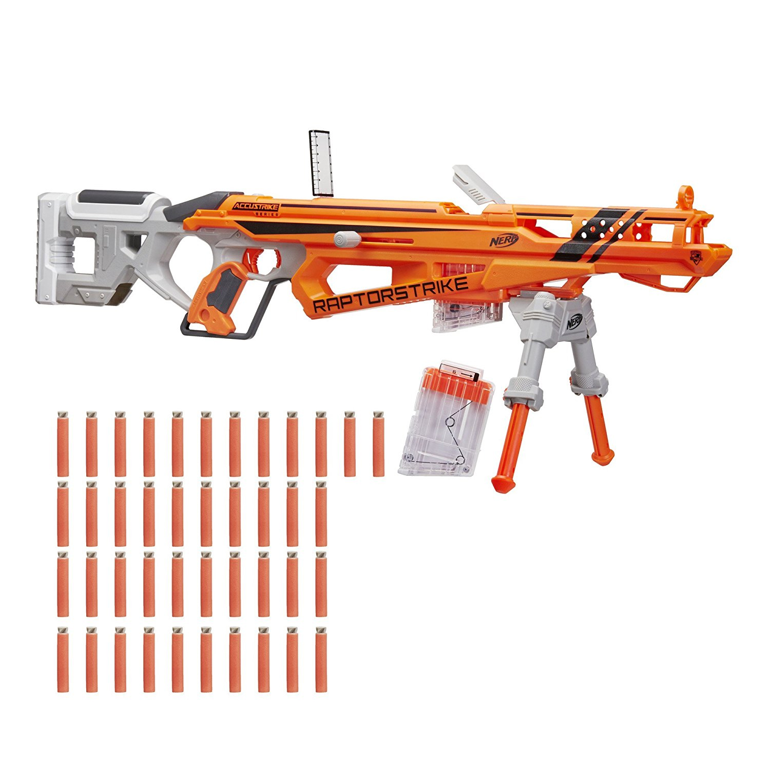 Nerf N-Strike Elite AccuStrike Raptorstrike to super celna snajperka, której długość wynosi aż 96 cm! Wyrzutnia zaprojektowana z myślą o dokładności z najcelniejszymi strzałkami Accustrike. Raptor strike posiada rozkładany celownik z podziałką, dzięki któremu możemy lepiej celować. Wyrzutnia posiada także dwójnóg z regulacją wysokości, dzięki któremu można wygodnie strzelać z pozycji leżącej. W zestawie mamy 2 magazynki Clip System, a w każdym z nich mieści się 6 strzałek. Wyrzutnia wyposażona jest na końcu w schowek na magazynek, dzięki czemu możesz szybko wymienić magazynek. Wyrzutnia jest również kompatybilna ze strzałkami Nerf Elite.