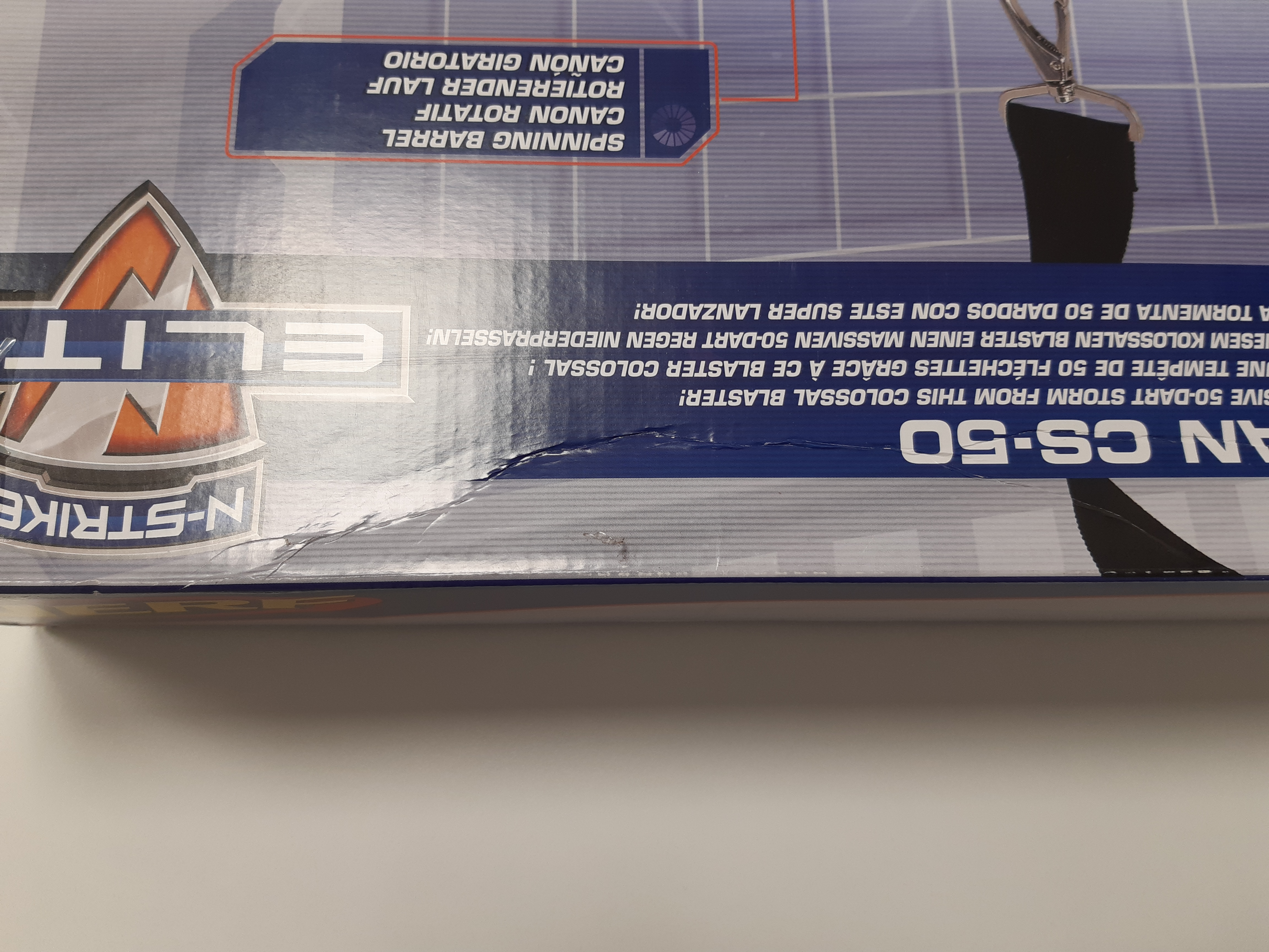 Podkręć obroty i wkrocz do walki z super wyrzutnią N-Strike Elite Titan CS-50, z największym magazynkiem w historii Nerf Elite, który pomieści 50 strzałek. Titan to w pełni automatyczna wyrzutnia, dzięki czemu za pomocą jednego naciśnięcia spustu, możemy wystrzelić magazynek w kilka sekund. Wyrzutnia posiada bardzo dobry zasięg, dochodzący do 27 metrów. Titan swoim wyglądem przypomina minigun'a. Wyrzutnia posiada cylindryczną lufę, która obraca się podczas strzelania. Posiada także jedną szynę taktyczną oraz dwa uchwyty na pasek, który otrzymujemy w zestawie.