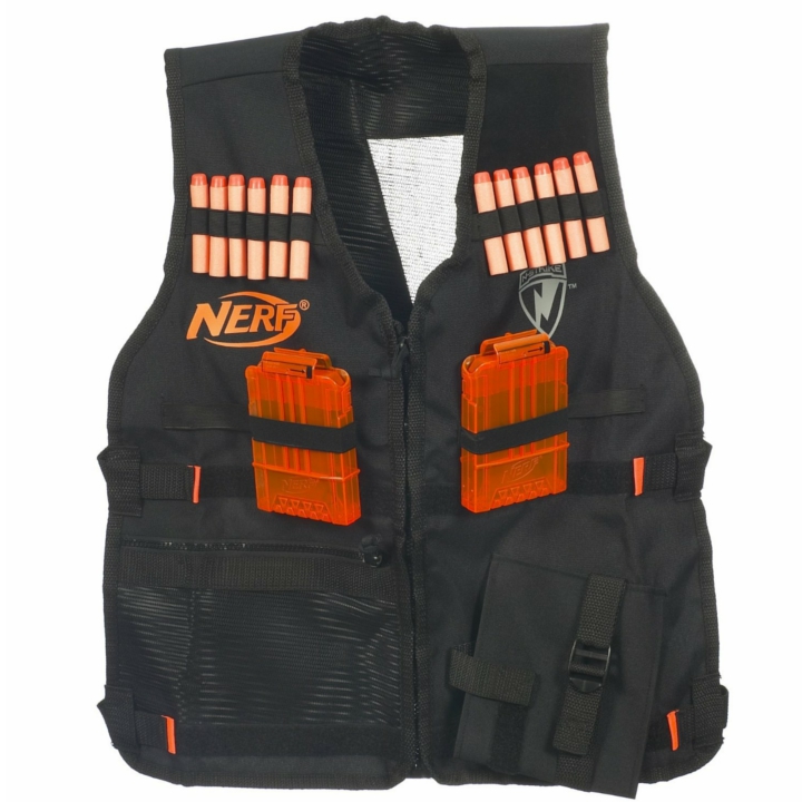 Oto wspaniała kamizelka taktyczna, z którą zawsze będziesz gotowy do zabawy! Kamizelka posiada specjalną kieszonkę do której można schować wyrzutnię Nerf N-strike Maverick oraz jedną kieszonkę na mniejszą wyrzutnię np. na Jolta lub na strzałki czy dyski. Kamizelka posiada też kieszenie na 4 magazynki typu Clip System i na magazynki na wodę. Kamizelka posiada także oddzielne kieszonki na 12 strzałek, a z tyłu kamizelki jest specjalna kieszeń na miecz Nerfa.