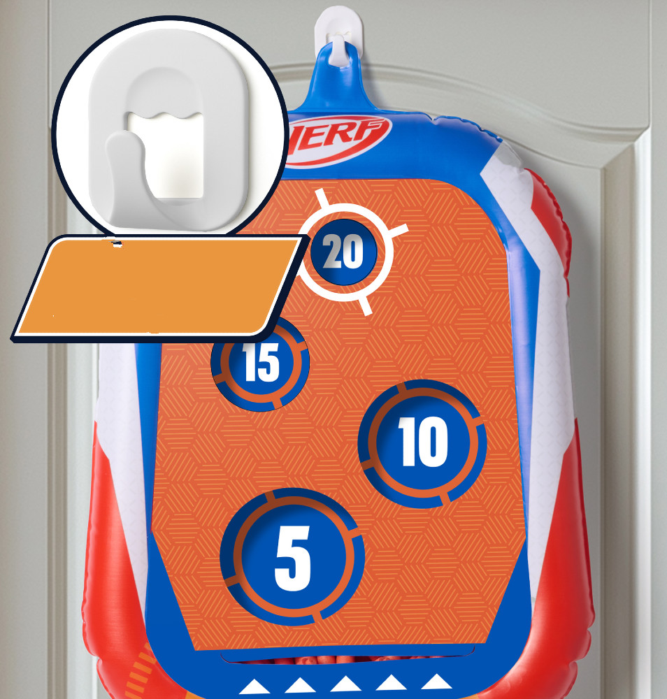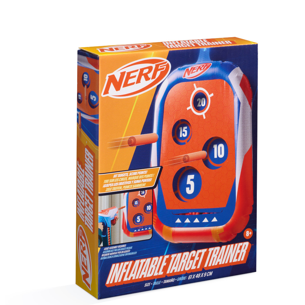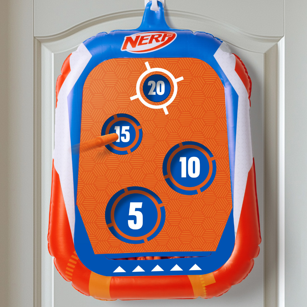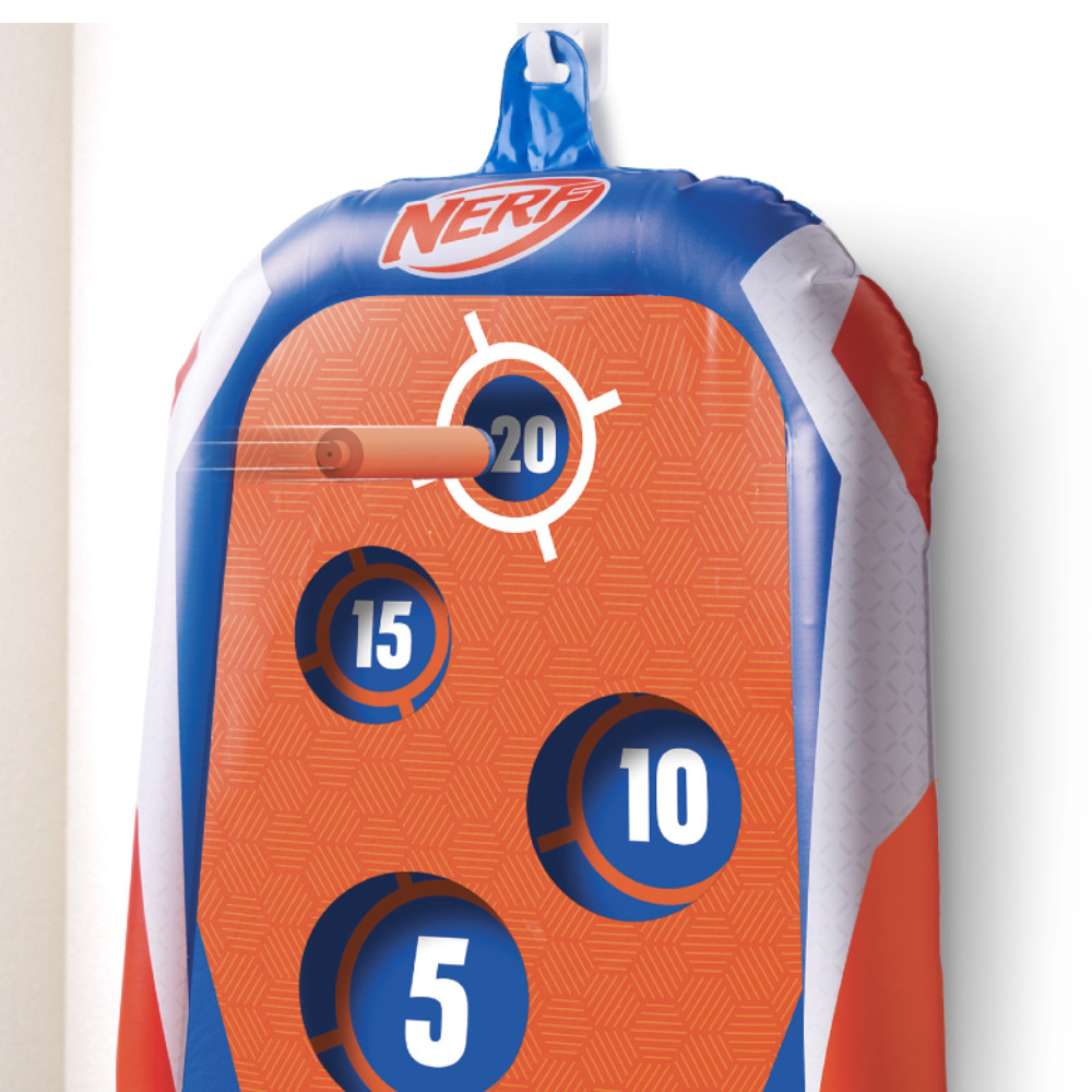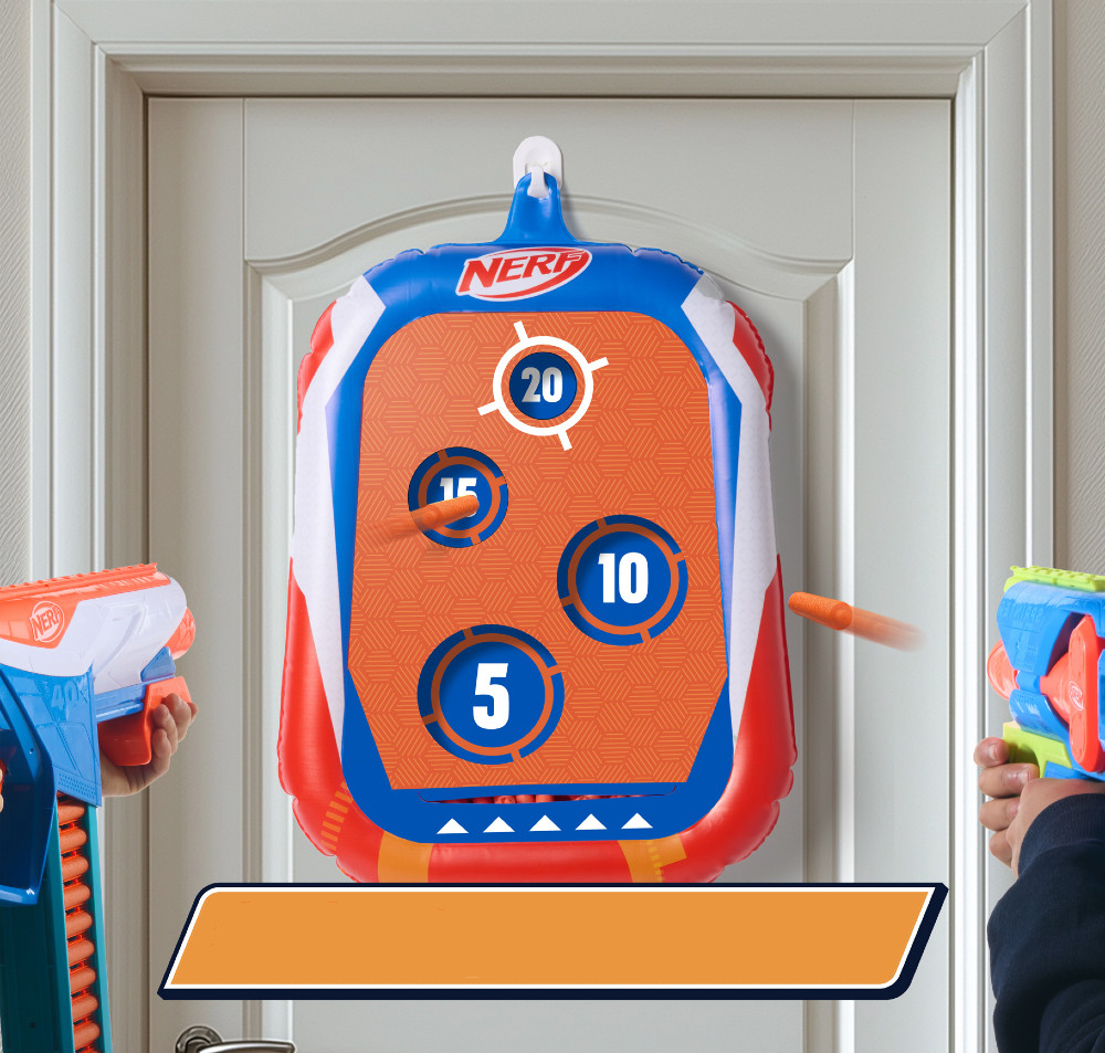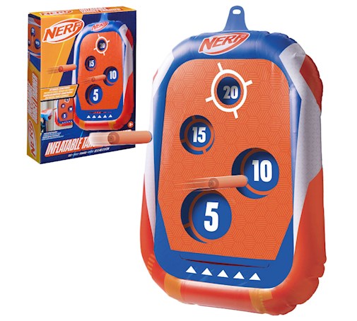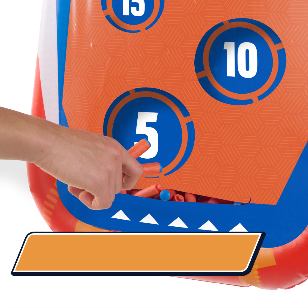 Podnieś swoje umiejętności strzelania z pistoletu na strzałki dzięki nadmuchiwanej tarczy treningowej NERF! Wystarczy ją nadmuchać, zawiesić za pomocą dołączonego haczyka ściennego i można zaczynać strzelanie. Idealna do zabawy w pomieszczeniach, lekka, bezpieczna i nie wymaga baterii. Zdobywaj punkty, trafiając w strefy tarczy, a strzałki wyjmuj z wbudowanego pojemnika. Świetna do samodzielnych ćwiczeń lub przyjacielskich pojedynków