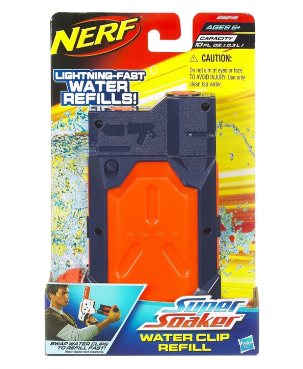 Magazynek ma pojemność 0.3 l i pasuje do pistoletów z serii Nerf Super Soaker. Dzięki klipsowi łatwo doczepić go np.: do paska przy spodniach.