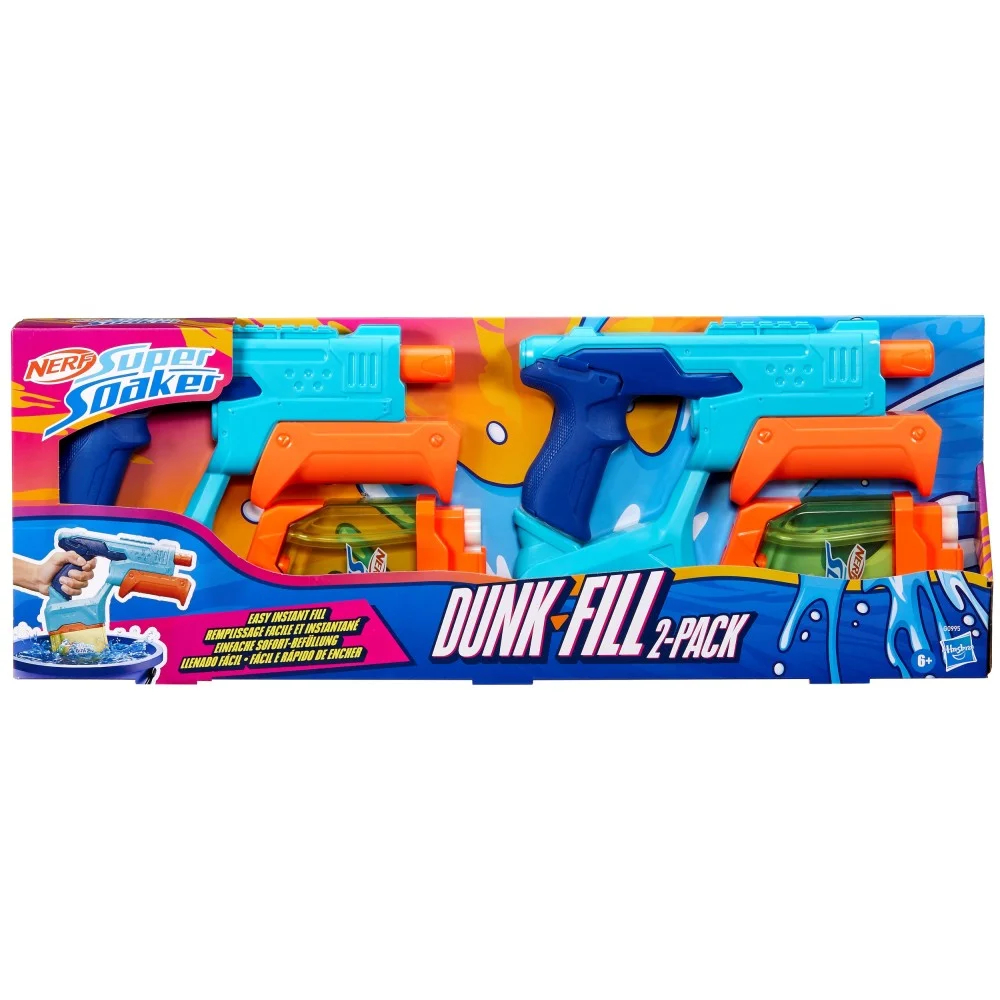 Zestaw Nerf Super Soaker Dunk-Fill 2-Pack zawiera 2 pistolety na wodę z łatwymi w napełnianiu zbiornikami, dzięki czemu w mgnieniu oka jesteś gotowy do zabawy w wodzie! Innowacyjna konstrukcja zbiornika pozwala na bardzo szybkie napełnianie — wystarczy zanurzyć i gotowe! Nie musisz nic robić, po prostu zanurz zbiorniki w wodzie i obserwuj, jak natychmiast się napełniają!