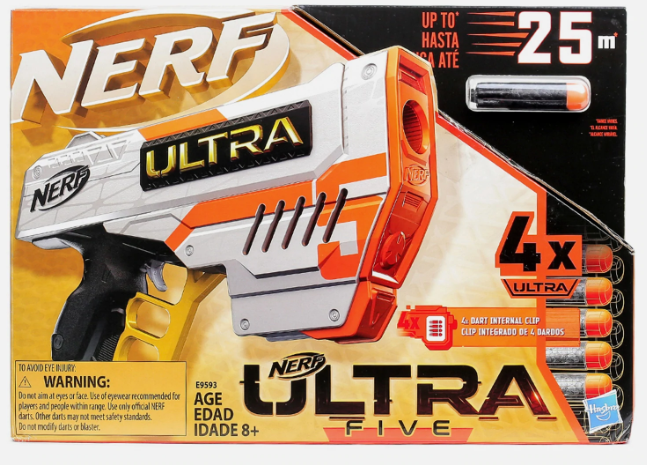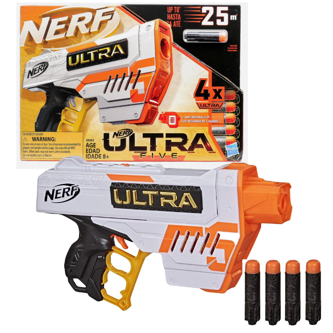 Oto kolejna wyrzutnia z supercelnej serii Nerf Ultra. Pistolet Nerf Ultra Five posiada wewnętrzny magazynek, który pomieści do 4 strzałek. Żeby wystrzelić, wystarczy przeładować wyrzutnię do tyłu, załadować wewnętrzny magazynek, a następnie nacisnąć spust. Wyrzutnia ma bardzo dobry zasięg i strzela do 25 metrów. Ultra Five jest bardzo lekki, poręczny i łatwy w obsłudze. Specjalne strzałki Nerf Ultra są wyjątkowe i nie są kompatybilne z innymi seriami Nerf. Strzałki Nerf Ultra cechują się wyjątkową szybkością, precyzyjnością oraz odległością.
