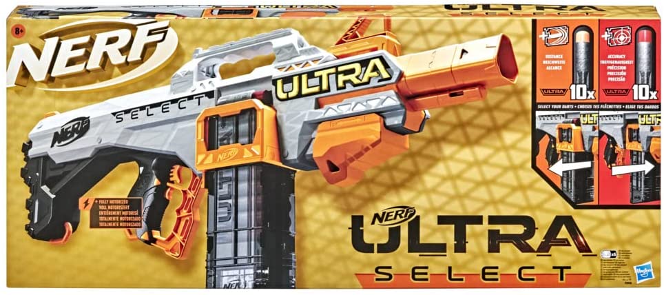 Stań do walki z niezwykle precyzyjną wyrzutnią Nerf Ultra Select. Wyjątkowość wyrzutni zapewniają nowoczesne strzałki Nerf Ultra, które zapewniają niezwykłą dokładność, szybkość i odległość strzału. Jest to wyrzutnia o zasięgu około 25 metrów. Wyposażona jest w 2 magazynki typu clip system na 10 strzałek, dzięki którym daje dużą przewagę nad przeciwnikiem. W zestawie znajdują się również 2 rodzaje strzałek: 10 Nerf Ultra Distance i 10 Nerf Ultra Precision. Przesuwając pomarańczowy przełącznik znajdujący się z przodu wyrzutni, wybieramy odpowiedni magazynek i amunicję, z której chcemy strzelać. Zautomatyzowana wyrzutnia Ultra One działa wyłącznie ze strzałkami Nerf Ultra. Ponadto wyrzutnia posiada dwie szynę taktyczną,punkty mocowania paska oraz wygodny uchwyt.