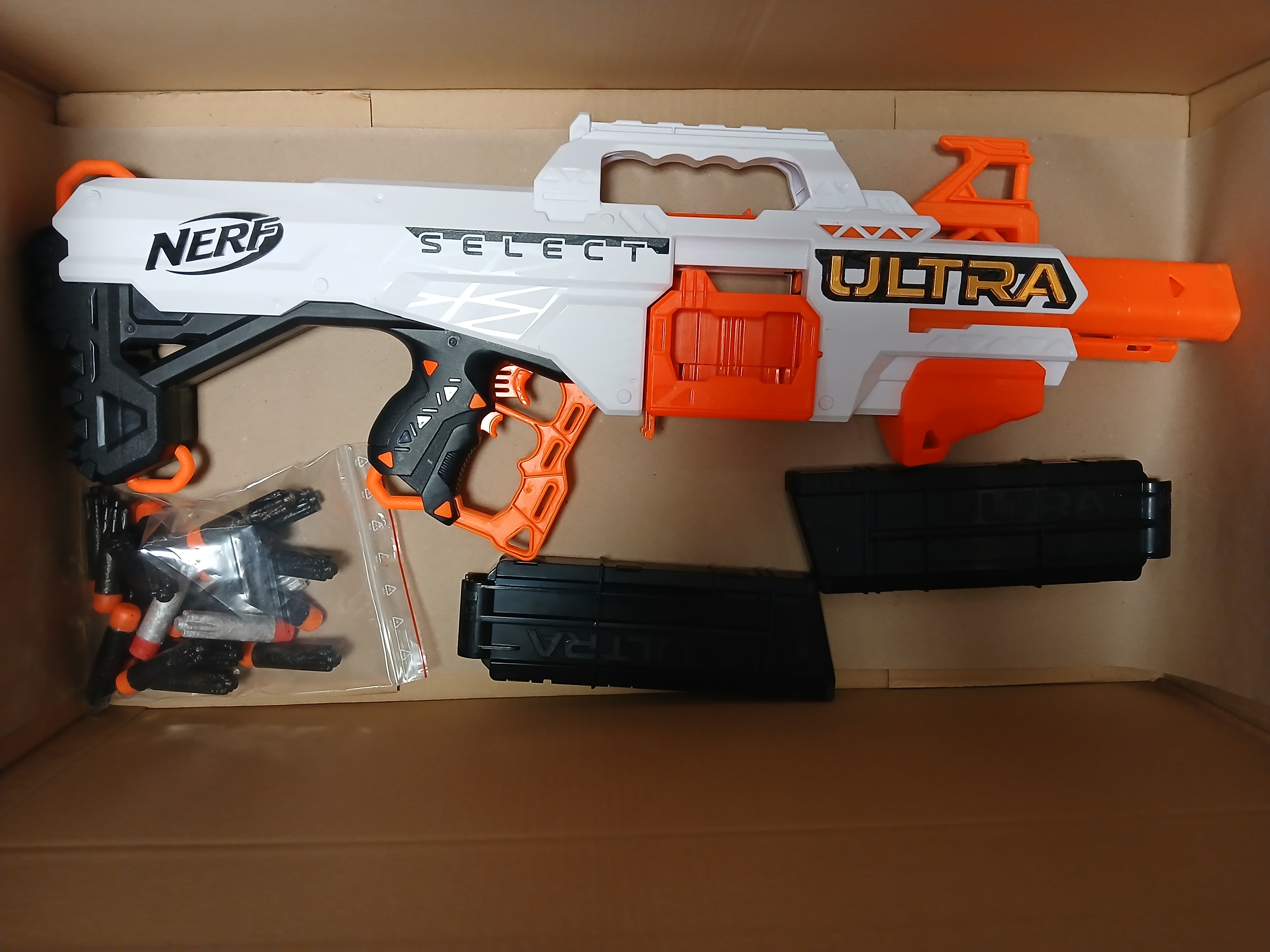 Stań do walki z niezwykle precyzyjną wyrzutnią Nerf Ultra Select. Wyjątkowość wyrzutni zapewniają nowoczesne strzałki Nerf Ultra, które zapewniają niezwykłą dokładność, szybkość i odległość strzału. Jest to wyrzutnia o zasięgu około 25 metrów. Wyposażona jest w 2 magazynki typu clip system na 10 strzałek, dzięki którym daje dużą przewagę nad przeciwnikiem. W zestawie znajduje się również 20 strzałek. Przesuwając pomarańczowy przełącznik znajdujący się z przodu wyrzutni, wybieramy odpowiedni magazynek i amunicję, z której chcemy strzelać. Zautomatyzowana wyrzutnia Ultra One działa wyłącznie ze strzałkami Nerf Ultra. Ponadto wyrzutnia posiada dwie szynę taktyczną,punkty mocowania paska oraz wygodny uchwyt.