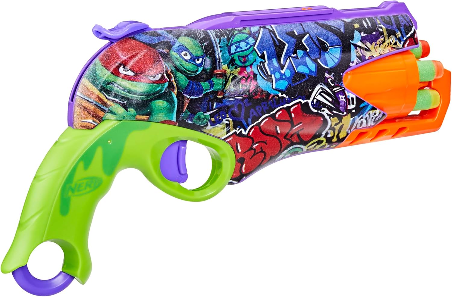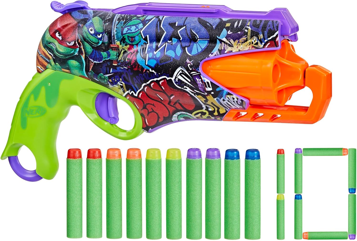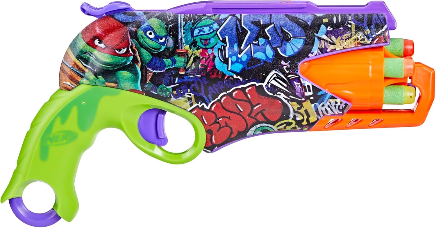 Cowabunga! Uwolnij mutant chaos i dołącz do drużyny Wojowniczych Żółwi Ninja z wyjątkow wyrzutnią NERF inspirowanym TMNT! Ten kolorowy, dynamiczny pistolet to idealny dodatek do kolekcji każdego fana Żółwi Ninja. Stylowy design z kultowymi grafikami TMNT po obu stronach, obrotowa magazynek i prosta obsługa gwarantują długie godziny zabawy.