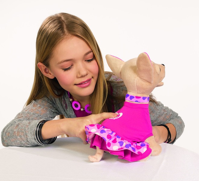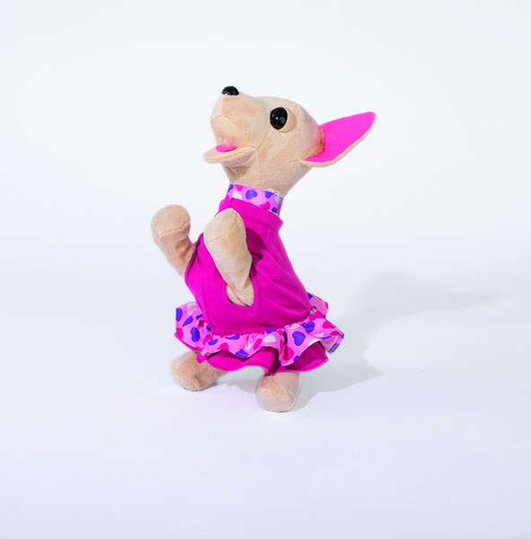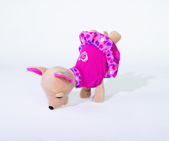 Chi chi ma jasną sierści, ubrana jest w różową sukieneczkę z falbanką w serduszka. Do zestawu dołączona jest także obroża oraz torebka dopasowana kolorystyką do sukienki pieska. Możesz włożyć małego piesek Chi chi do torebki i odbyć z nim wiele ciekawych podróży.