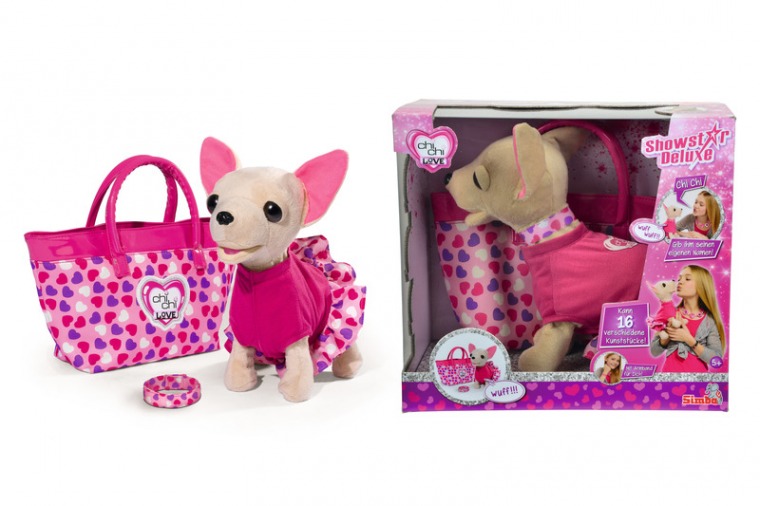 Piesek Chi Chi Love Showstar Delux to interaktywna, pluszowa zabawka. Chi chi zna wiele sztuczek: rusza pyszczkiem, tańczy, śpiewa, staje na głowie, szczeka, robi różne triki. Jeśli naciśniesz na przycisk na grzbiecie pieska możesz nadać lub zmienić mu imię, na takie na jakie tylko będziesz miała ochotę. Pamiętaj, chi chi reaguje na komendy tylko po usłyszeniu swojego imienia!