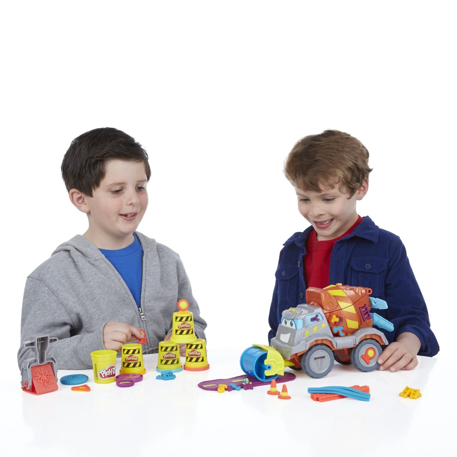 Zostań kierownikiem swojego placu budowy wraz z betoniarką Max. Wyciskaj różne kształty dzięki szynowej foremce. Za pomocą wałka sprawisz, że powierzchnie Twoich dróg będą gładkie i płaskie. Możesz też zniszczyć swój plac budowy rozbijając go młotem pneumatycznym, a 5 tub Play-Doh może posłużyć Ci jako pachołki.