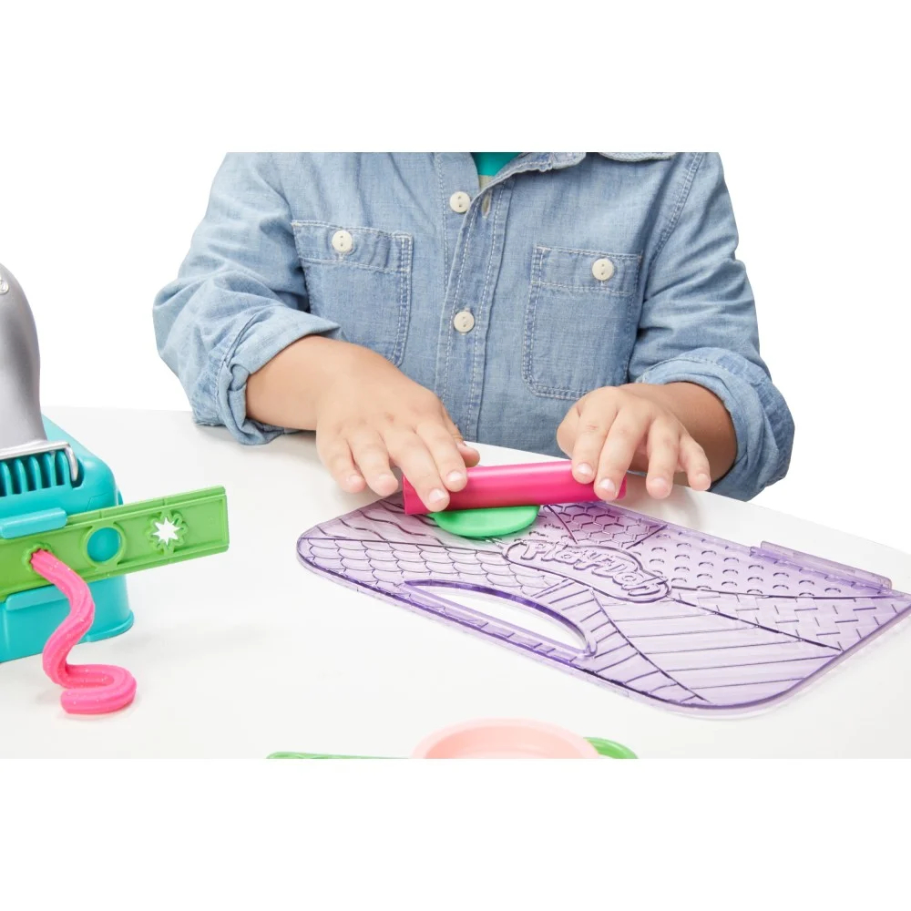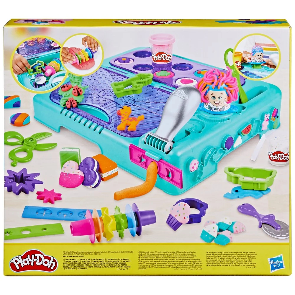 Wszystko w jednym zestawie! Dzięki temu rozbudowanemu zestawowi Play- Doh można rozbudzić ciekawość i chęć odkrywania. Tutaj dzieci znajdą wszystko czego potrzebują w praktycznym zestawie do noszenia, aby nauczyć się zabawy z podkładkami do wyciskania, narzędziami do ugniatania, foremkami, nożyczkami i aż 10 kolorami.