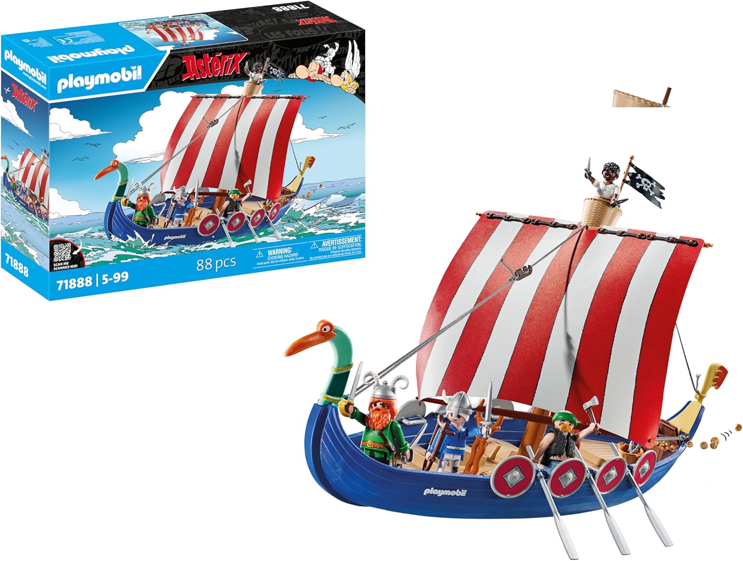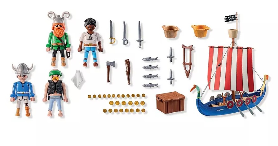 Wyrusz w rejs statkiem pirackim Asterixa i dołącz do nieustraszonej załogi podczas ekscytującej wyprawy po skarby. Odkrywaj ukryte skarby za pomocą złotych monet, drewnianej laski i innych akcesoriów, aby przeżyć niekończące się kreatywne przygody. Statek posiada miejsce dla sześciu wioślarzy i wieżę obserwacyjną w bocianim gnieździe. Piraci są gotowi na kolejną misję! Schowaj skrzynię ze skarbami, wciągnij piracką flagę i chwyć za miecze i szable, aby bronić się przed wrogami. Statek wypełniony jest po brzegi ekscytującymi szczegółami, takimi jak wędka, złote monety, a nawet drewniana kula – idealna na śmiałe rajdy lub niefortunne spotkania z Galami! Odkryj ukryte skarby ze złotymi monetami, drewnianą kulą i innymi przedmiotami, aby przeżyć niekończące się kreatywne przygody.