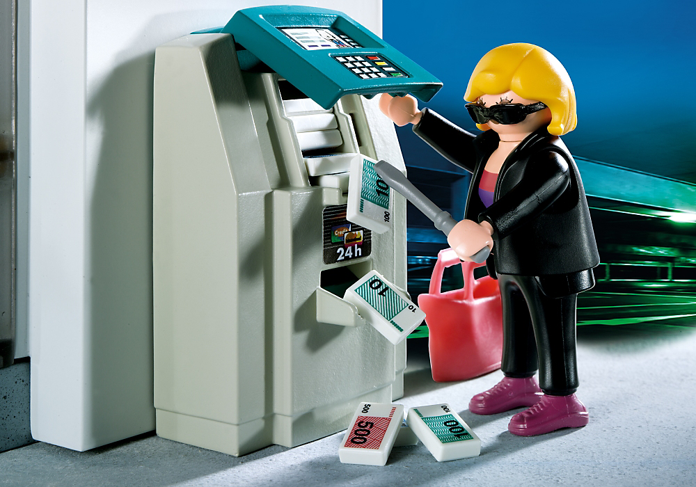 Playmobil Policja Bank z bankomatem 5177 to zestaw, który świetnie sprawdza się podczas odgrywania sceny napadu na bank. Z bankomatu, za pomocą karty można wypłacić pieniądze.