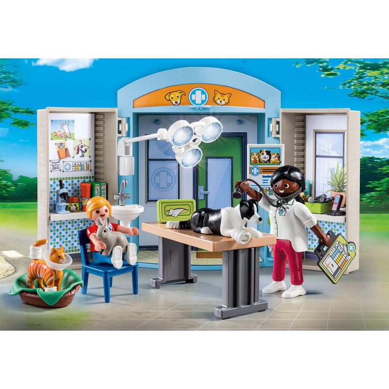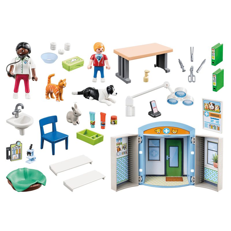 Zestaw stanowi wygodna skrzyneczka, którą można łatwo złożyć i przenieść i to wewnątrz skrzyneczki znajduje się sceneria do zabawy. Zestaw to wspaniały zestaw do zabawy dla wszystkich miłośników zwierząt. Sympatyczny weterynarz opiekuje się wszystkimi chorymi czworonożnymi przyjaciółmi w swoim gabinecie, tymi małymi i tymi większymi. Przyjazny lekarz z pewnością znajdzie rozwiązanie na każdy problem. Praktyczna walizka zawiera mały gabinet weterynaryjny z weterynarzem i chłopcem, border collie, kotem, królikiem, lampę lekarską, stół do badań, kryzę, bandaże i wiele innych dodatków.