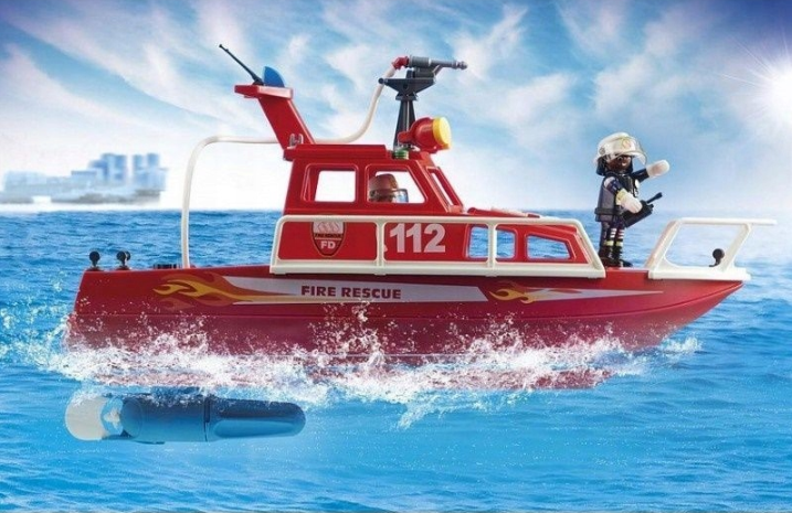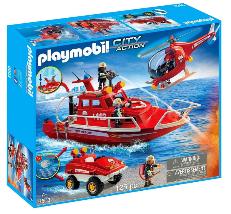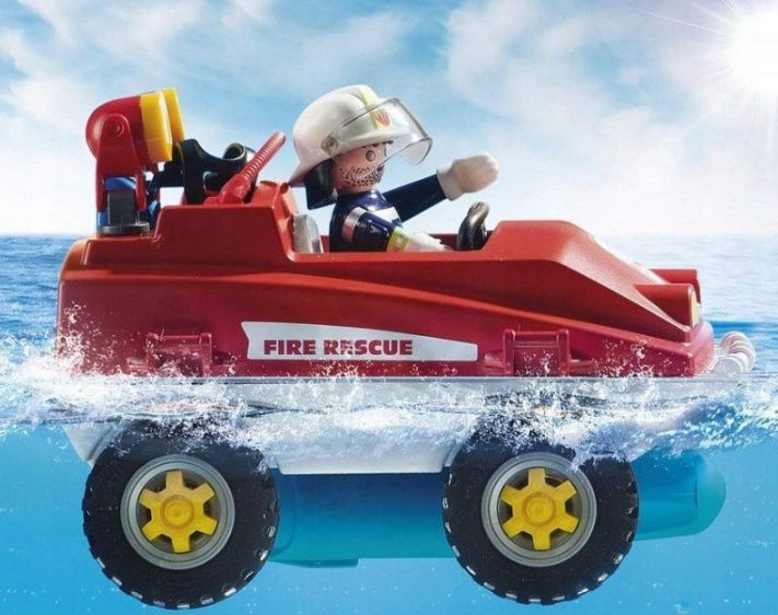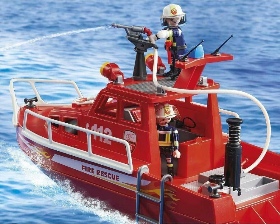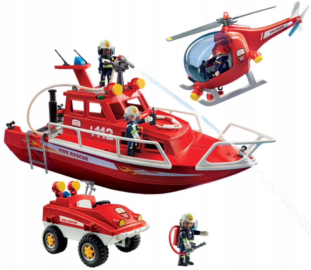 Ruszaj na akcję ratunkową razem ze strażą przybrzeżną, która musi wykazać się natychmiastową gotowością. Straż zmotywowała wszystkie dostępne środki, aby ugasić rozprzestrzeniający się pożar. Dzielni strażacy wsiedli do pływającej łodzi strażackiej, która wyposażona jest w działającą pompkę ze zbiorniczkiem na wodę do działka wodnego i ruszyła do akcji. Łódź posiada także zdejmowany dach i otwieraną kabinę. Helikopter posiada otwieraną kabinę oraz obracające się śruby napędowe, które umożliwiają zawiśnięcie nad pożarem i pomaganie w akcji. Amfibia potrafi unosić się na wodzie i jeździć po lądzie. Helikopter pomieści dwóch strażaków, amfibia jednego, a łódź trzech resztę załogi. Wkrocz do akcji i ugaś pożar wraz z nieustraszonym zespołem straży przybrzeżnej Playmobil.