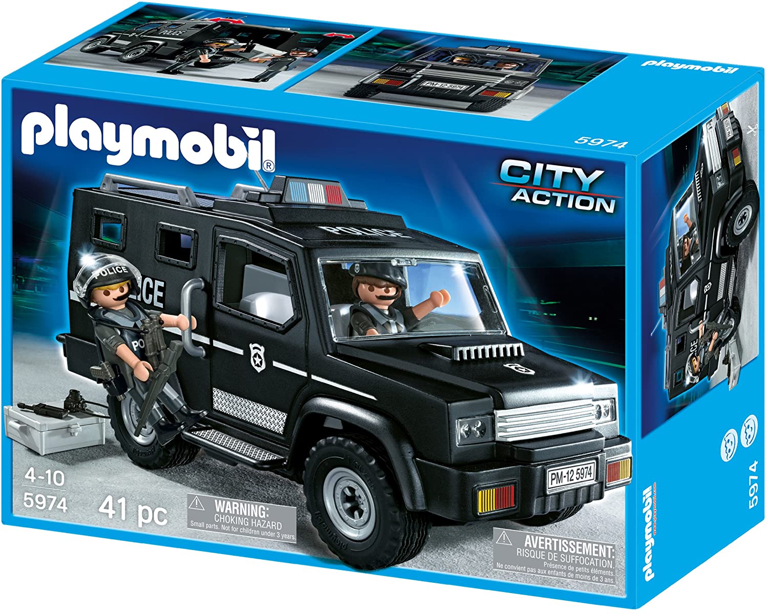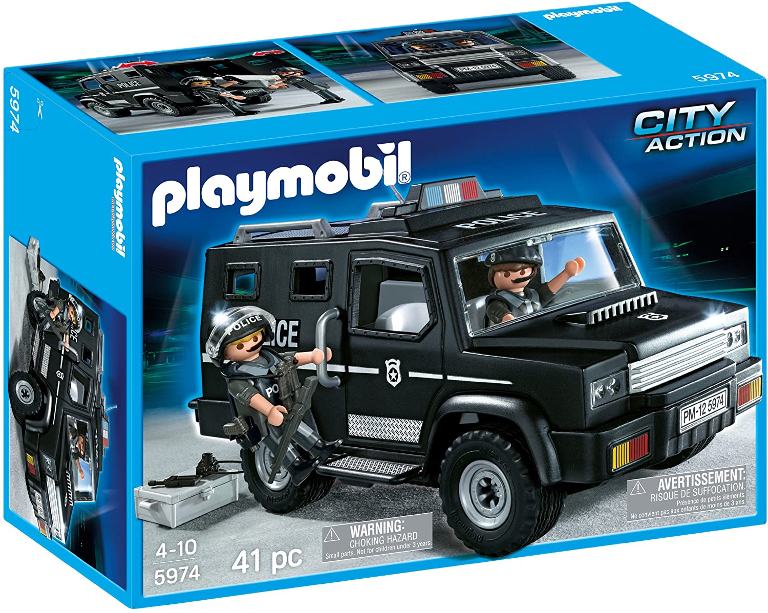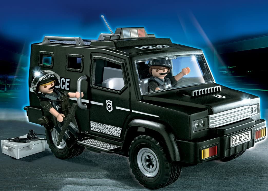 Wyspecjalizowany oddział jednostki specjalnej ma do dyspozycji pojazd terenowy wraz z bronią i niezbędnym sprzętem. Opancerzony pojazd do zadań specjalnych ma zdejmowany dach oraz otwierane tylne drzwi ułatwiające załadunek. Policjanci mogą przewieźć niebezpieczny ładunek, którego transport zwykłym radiowozem byłby zbyt niebezpieczny i łatwo byłoby go zaatakować lub okraść. W zestawie znajdują się 2 figurki Playmobil przedstawiające funkcjonariuszy policyjnych ubranych w mundury jednostki specjalnej.