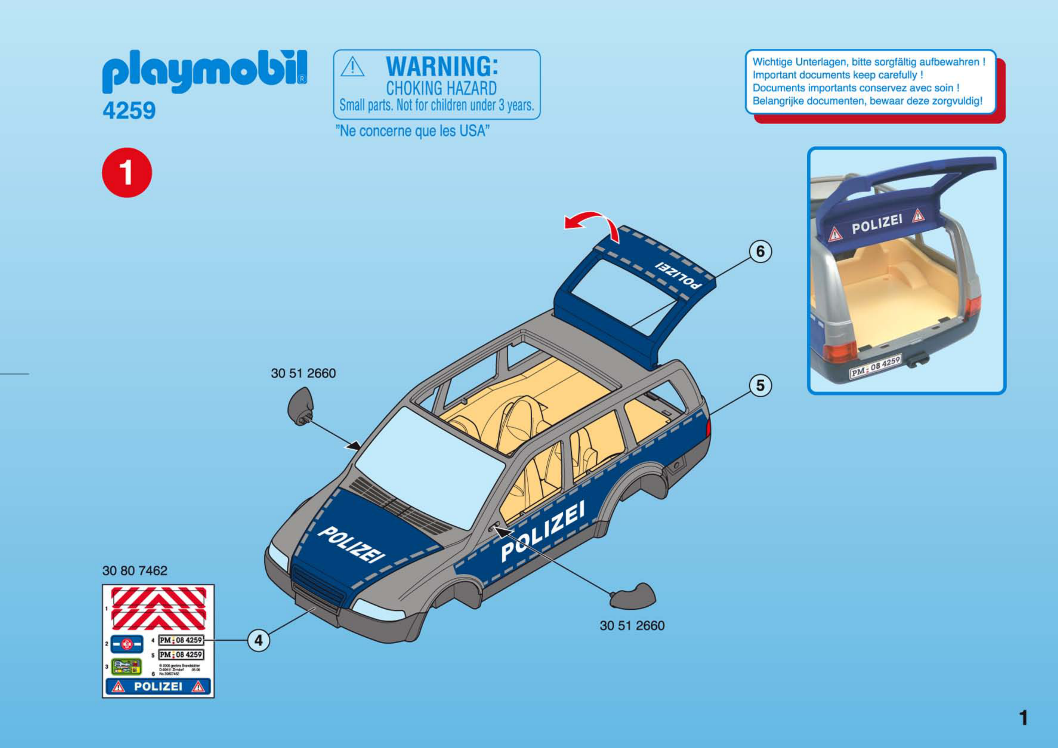 Zestaw należy do serii City Action. Szybka akcja, niebezpieczne pościgi, poszukiwania skradzionych klejnotów oraz włamania do sejfów, to tylko niektóre z atrakcji jakie czekają na małych fanów Playmobil. Przyłącz się do pościgu za złodziejami i odbierz im skradzione skarby. W skład zestawu wchodzi radiowóz z działającym niebieskim światłem i zdejmowanym dachem. Maska i tylna klapa sa otwierane, a tylne siedzenie samochodu jest składane.